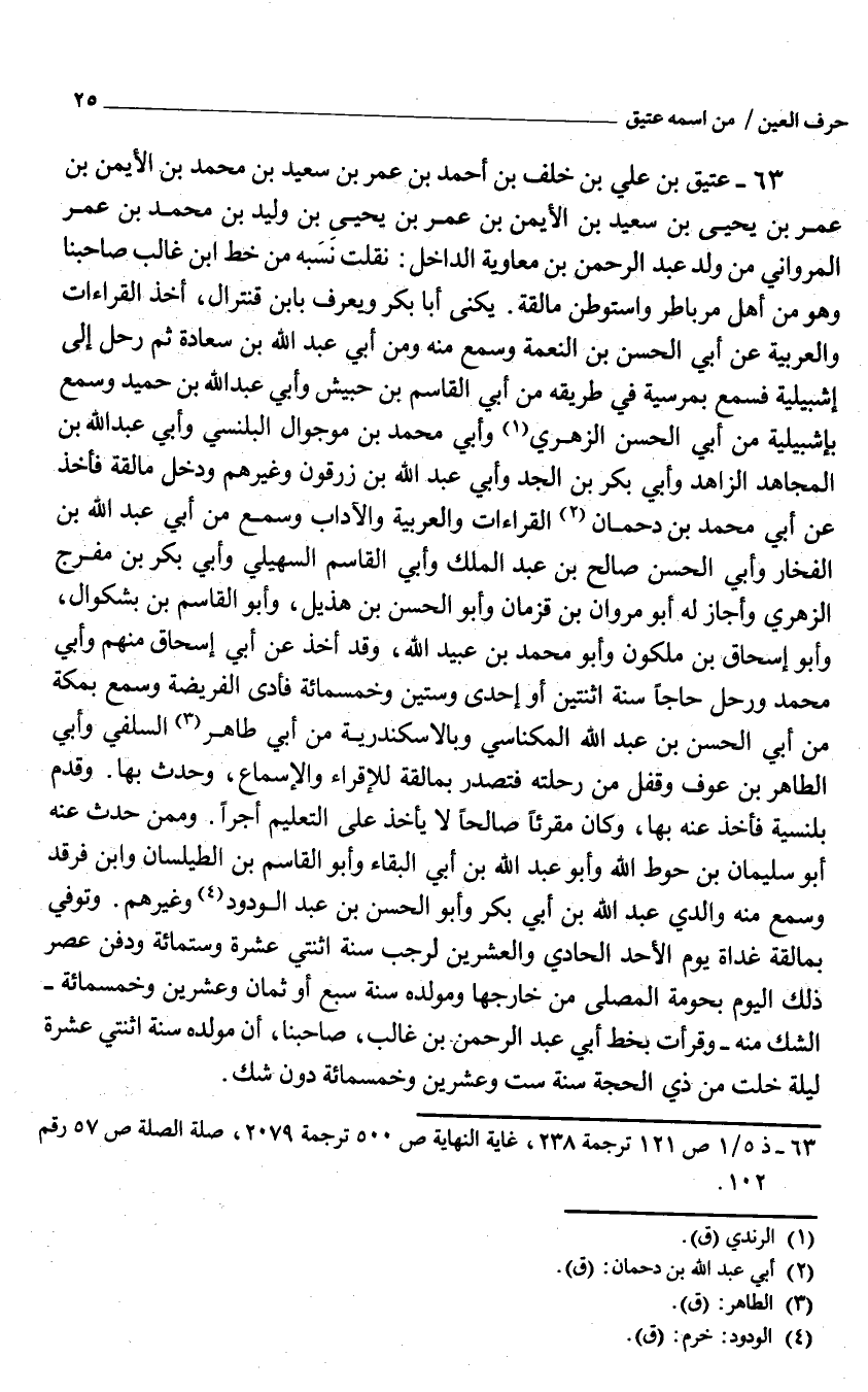 63 - عَتيق بن عَليّ بن خَلَف بْن أَحْمَد بْن عُمَر بْن سَعِيد بْن مُحَمَّد بْن الْأَيْمن بن عمر بن يحيى بن سعيد بن الْأَيْمن بن عمر بن يحيى بن وليد بن مُحَمَّد بن عمر المرواني من وُلِدَ عَبْد الرَّحْمَن بْن مُعَاوِيَة الدَّاخِل نقلت نسبه من خطّ ابْن غَالب صاحبنا وَهُوَ من أهل مرباطر واستوطن مالقة يكنى أَبَا بَكْر وَيعرف بِابْن قنترال أَخذ الْقرَاءَات والعربية عَن أَبِي الْحسن بن النِّعْمَة وَسمع مِنْهُ وَمن أبي عَبْد اللَّه بن سَعَادَة ثمَّ رَحل إِلَى إشبيلية فَسمع بمرسية فِي طَرِيقه من أبي القَاسِم بْن حُبَيْش وَأبي عَبْد اللَّه بْن حُمَيْد وَسمع بإشبيلية من أبي الْحسن الزُّهْرِيّ وَأبي مُحَمَّد بن موجوال البلنسي وَأبي عبد الله بن الْمُجَاهِد الزَّاهِد وَأبي بكر بن الْجد وَأبي عَبْد اللَّه بْن زرقون وَغَيرهم وَدخل مالقة فَأخذ عَن أبي مُحَمَّد بن دحمان الْقرَاءَات والعربية والآداب وَسمع من أبي عَبْد اللَّه بْن الفخار وَأبي الْحَسَن صَالح بْن عَبْد الْملك وَأبي الْقَاسِم السُّهيْلي وَأبي بكر بن مفرج الزُّهْرِيّ وَأَجَازَ لَهُ أَبُو مَرْوَان بْن قزمان وَأَبُو الْحسن بن هُذَيْل وَأَبُو الْقَاسِم بْن بشكوال وَأَبُو إِسْحَاق بْن ملكون وَأَبُو مُحَمَّد بن عبيد الله وَقد أَخذ عَن أبي إِسْحَاق مِنْهُم وَأبي مُحَمَّد ورحل حَاجا سنة اثْنَتَيْنِ أَو إِحْدَى وَسِتِّينَ وَخَمْسمِائة فَأدى الْفَرِيضَة وَسمع بِمَكَّة من أبي الْحسن بن عبد الله المكناسي وبالإسكندرية من أبي طَاهِر السلَفِي وَأبي الطَّاهِر بن عَوْف وقفل من رحلته فتصدر بمالقة للإقراء والإسماع وَحدث بهَا وَقدم بلنسية فَأخذ عَنهُ بهَا وَكَانَ مقرئا صَالحا لَا يَأْخُذ على التَّعْلِيم أجرا وَمِمَّنْ حدث عَنهُ أَبُو سُلَيْمَان بْن حوط اللَّه وَأَبُو عَبْد اللَّه بْن أبي الْبَقَاء وَأَبُو الْقَاسِم بن الطيلسان وَابْن فرقد وَسمع مِنْهُ وَالِدي عبد الله بن أبي بكر وَأَبُو الْحسن بن عبد الْوَدُود وَغَيرهم وَتُوفِّي بمالقة غَدَاة يَوْم الْأَحَد الْحَادِي وَالْعِشْرين لرجب سنة اثْنَتَيْ عشرَة وسِتمِائَة وَدفن عصر ذَلِك الْيَوْم بحومة الْمصلى من خَارِجهَا ومولده سنة سبع أَو ثَمَان وَعشْرين وَخَمْسمِائة الشَّك مِنْهُ وقرأت بِخَط أبي عبد الرَّحْمَن بن غَالب صاحبنا أَن مولده سنة اثْنَتَيْ عشرَة لَيْلَة خلت من ذِي الْحجَّة سنة سِتّ وَعشْرين وَخَمْسمِائة دون شكّ