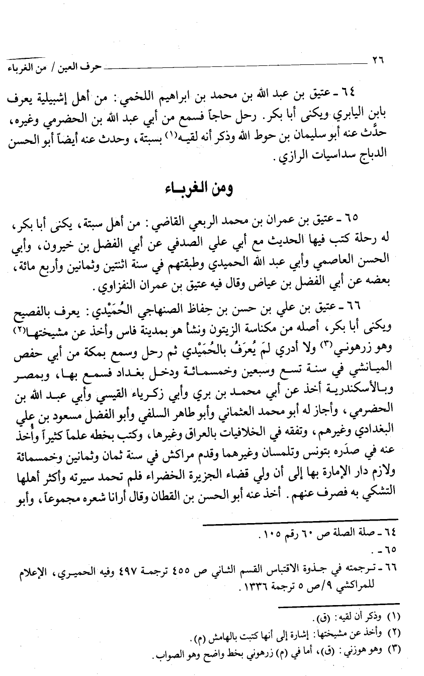66 - عَتيق بن عَليّ بن حسن بن حفاظ الصنهاجي الْحميدِي يعرف بالفصيح ويكنى أَبَا بكر أَصله من مكناسة الزَّيْتُون وَنَشَأ هُوَ بِمَدِينَة فاس وَأخذ عَن مشيختها وَهُوَ زرهوني وَلَا أَدْرِي لم يعرف بالحميدي ثمَّ رَحل وَسمع بِمَكَّة من أبي حَفْص الميانشي فِي سنة تسع وَسبعين وَخَمْسمِائة وَدخل بَغْدَاد فَسمع بهَا وبمصر وبالإسكندرية أَخذ عَن أبي مُحَمَّد بن بري وَأبي زَكَرِيَّاء الْقَيْسِي وَأبي عَبْد اللَّه بْن الحضْرميّ وَأَجَازَ لَهُ أَبُو مُحَمَّد العثماني وَأَبُو طَاهِر السلَفِي وَأَبُو الْفضل مَسْعُود بن على الْبَغْدَادِيّ وَغَيرهم وتفقه فِي الخلافيات بالعراق وَغَيرهَا وَكتب بِخَطِّهِ علما كثيرا وَأخذ عَنهُ فِي صَدره بتونس وتلمسان وَغَيرهمَا وَقدم مراكش فِي سنة ثَمَان وَثَمَانِينَ وَخَمْسمِائة ولازم دَار الْإِمَارَة بهَا إِلَى أَن ولي قَضَاء الجزيرة الخضراء فَلم تحمد سيرته وَأكْثر أَهلهَا التشكي بِهِ فصرف عَنْهُم أَخذ عَنْهُ أَبُو الْحَسَن بْن الْقطَّان وَقَالَ أرانا شعره مجموعا وَأَبُو