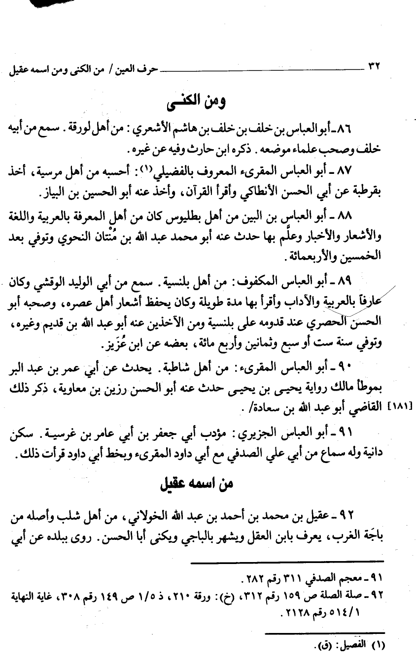 92 - عقيل بن مُحَمَّد بْن أَحْمَد بْن عَبْد الله الْخَولَانِيّ من أهل شلب وَأَصله من باجة الغرب يعرف بِابْن الْعقل ويشهر بالباجي ويكني أَبَا الْحسن روى بِبَلَدِهِ عَن أبي