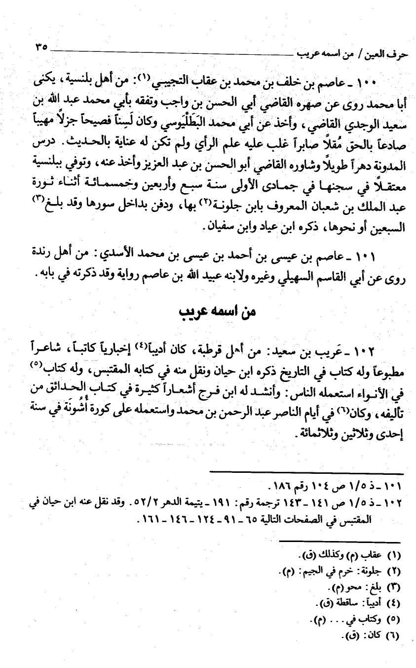 102 - عريب بن سعيد من أهل قرطبة كَانَ أديبا إخباريا كَاتبا شَاعِرًا مطبوعا وَله كتاب فِي التَّارِيخ ذكره ابْن حَيَّان وَنقل مِنْهُ كِتَابه المقتبس وَله كتاب فِي الأنواء اسْتَعْملهُ النَّاس وَأنْشد لَهُ ابْن فرج أشعارا كَثِيرَة فِي كتاب الحدائق من تأليفه وَكَانَ فِي أَيَّام النَّاصِر عَبْد الرَّحْمَن بن مُحَمَّد وَاسْتَعْملهُ على كورة أشونة فِي سنة إِحْدَى وَثَلَاثِينَ وثلاثمائة