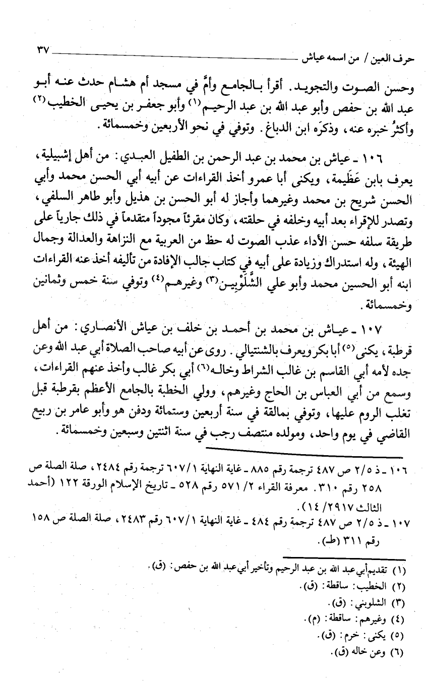 107 - عَيَّاش بن مُحَمَّد بن أَحْمد بن خلف بن عَيَّاش الْأنْصَارِيّ من أَهْلَ قرطبة يكنى أَبَا بكر وَيعرف بالشنتيالي روى عَن أَبِيه صَاحب الصَّلَاة أبي عبد الله وَعَن جده لأمه أبي الْقَاسِم بن غَالب الشراط وخاله أبي بكر غَالب وَأخذ عَنْهُم الْقرَاءَات وَسمع من أبي الْعَبَّاس بن الْحَاج وَغَيرهم وَولي الْخطْبَة بالجامع الْأَعْظَم بقرطبة قبل تغلب الرّوم عَلَيْهَا وَتُوفِّي بمالقة فِي سنة أَرْبَعِينَ وسِتمِائَة وَدفن هُوَ وَأَبُو عَامر بن ربيع القَاضِي فِي يَوْم وَاحِد ومولده منتصف رَجَب فِي سنة اثْنَتَيْنِ وَسبعين وَخَمْسمِائة.