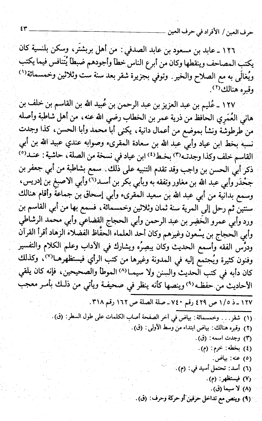 126 - عَابِد بن مَسْعُود بن عَابِد الصَّدَفِي من أهل بربشتر وَسكن بلنسية كَانَ يكْتب الْمَصَاحِف وينقطها وَكَانَ من أبرع النَّاس خطا وأجودهم ضبطا يتنافس فِيمَا يكْتب ويغالي بِهِ مَعَ الصّلاح وَالْخَيْر وَتُوفِّي بِجَزِيرَة شقر بعد سنة سِتّ وَثَلَاثِينَ وَخَمْسمِائة وقبره هُنَالك.