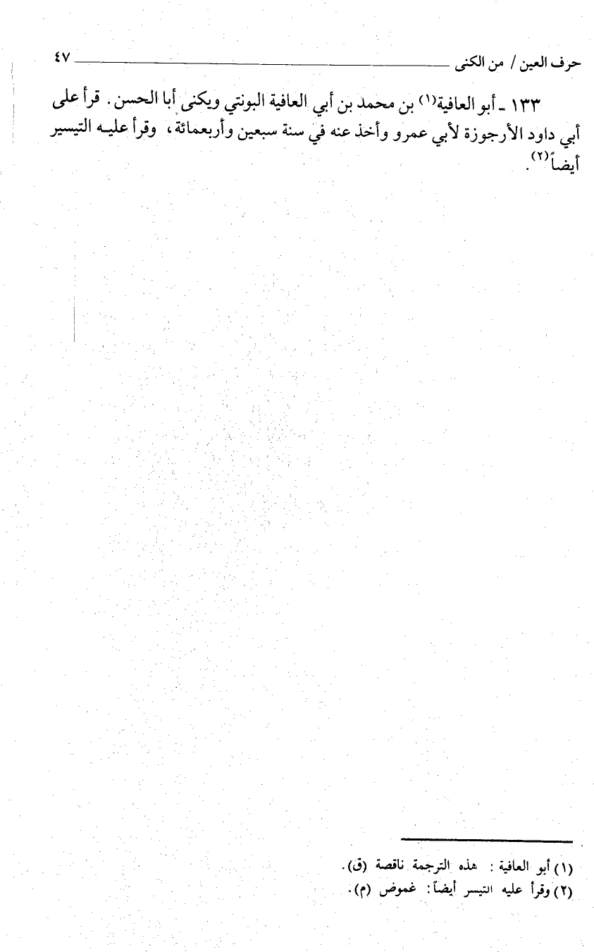 133 - أَبُو الْعَافِيَة بن مُحَمَّد بن أبي الْعَافِيَة البونتي ويكنى أَبَا الْحسن قَرَأَ على أبي دَاوُد الأرجوزة لأبي عَمْرو وَأخذ عَنهُ فِي سنة سبعين وَأَرْبَعمِائَة وَقَرَأَ عَلَيْهِ التَّيْسِير أَيْضا.