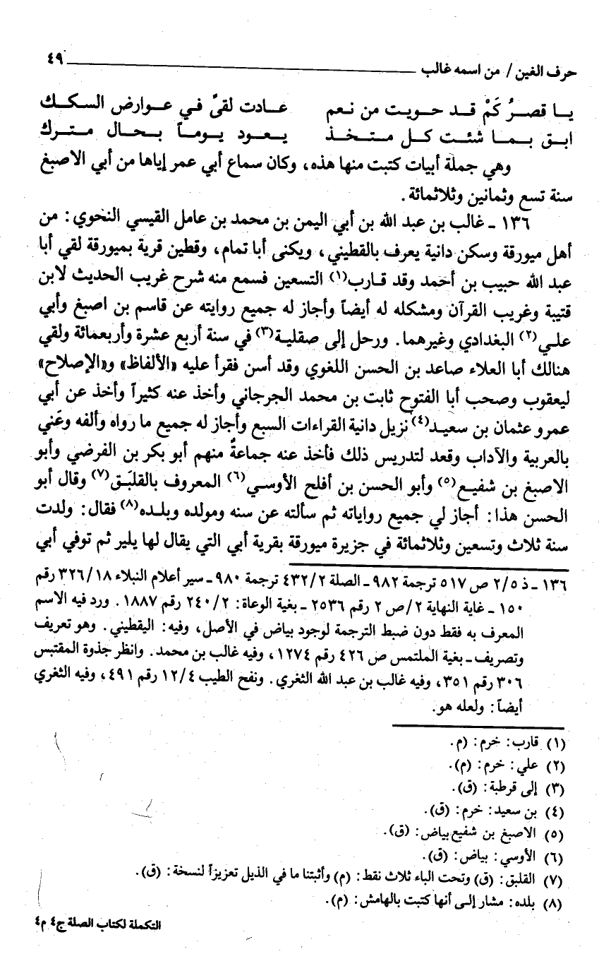 136 - غَالب بن عبد الله بن أبي الْيمن بن مُحَمَّد بن عَامل الْقَيْسِي النَّحْوِيّ من أهل ميورقة وَسكن دانية يعرف بالقطيني ويكنى أَبَا تَمام وقطين قَرْيَة بميورقة لَقِي أَبَا عبد الله حبيب بن أَحْمد وَقد قَارب التسعين فَسمع مِنْهُ شرح غَرِيب الحَدِيث لِابْنِ قُتَيْبَة وغريب الْقُرْآن ومشكله لَهُ أَيْضا وَأَجَازَ لَهُ جَمِيع رِوَايَته عَن قَاسم بن اصبغ وَأبي عَليّ الْبَغْدَادِيّ وَغَيرهمَا ورحل إِلَى صقلية فِي سنة أَربع عشرَة وَأَرْبَعمِائَة وَلَقي هُنَالك أَبَا الْعَلَاء صاعد بن الْحسن اللّغَوِيّ وَقد أسن فَقَرَأَ عَلَيْهِ الْأَلْفَاظ والإصلاح ليعقوب وَصَحب أَبَا الْفتُوح ثَابت بن مُحَمَّد الْجِرْجَانِيّ وَأخذ عَنهُ كثيرا وَأخذ عَن أبي عَمْرو عُثْمَان بن سعيد نزيل دانية الْقرَاءَات السَّبع وَأَجَازَ لَهُ جَمِيع مَا رَوَاهُ وألفه وعني بِالْعَرَبِيَّةِ والآداب وَقعد لتدريس ذَلِك فَأخذ عَنهُ جمَاعَة مِنْهُم أَبُو بكر بن الفرضي وَأَبُو الْأَصْبَغ بن شَفِيع وَأَبُو الْحسن بن أَفْلح الأوسي الْمَعْرُوف بالقلبق وَقَالَ أَبُو الْحسن هَذَا أجَاز لي جَمِيع رواياته ثمَّ سَأَلته عَن سنه ومولده وبلده فَقَالَ ولدت سنة ثَلَاث وَتِسْعين وثلاثمائة فِي جَزِيرَة ميورقة بقرية أبي الَّتِي يُقَال لَهَا يلير ثمَّ توفّي أبي