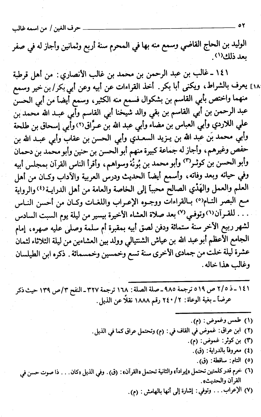 141 - غَالب بن عبد الرَّحْمَن بن مُحَمَّد بْن غَالب الأَنْصَاري من أَهْل قرطبة يعرف بالشراط ويكني أَبَا بكر أَخذ الْقرَاءَات عَن أَبِيه وَعَن أبي بَكْر بْن خَيّر وَسمع مِنْهُمَا واختص بِأبي الْقَاسِم بن بشكوال فَسمع مِنْهُ الْكثير وَسمع أَيْضا من أبي الْحسن عبد الرَّحْمَن بن أبي الْقَاسِم بن بَقِي وَالِد شَيخنَا أبي الْقَاسِم وَأبي عبد الله مُحَمَّد بن عَليّ اللاردي وَأبي الْعَبَّاس بن مضاء وَأبي عبد الله بن عراق وَأبي إِسْحَاق بن طَلْحَة وَأبي مُحَمَّد بن عبد الله بن يزِيد السَّعْدِيّ وَأبي الْحسن بن عِقَاب وَأبي عبد الله بن حَفْص وَغَيرهم وَأَجَازَ لَهُ جمَاعَة كَبِيرَة مِنْهُم أَبُو الْحسن بن حنين وَأَبُو مُحَمَّد بن دحمان وَأَبُو الْحسن بن كوثر وَأَبُو مُحَمَّد بن بونة وسواهم وأقرأ النَّاس الْقُرْآن بِمَجْلِس أَبِيه وَفِي حَيَاته وَبعد وَفَاته وأسمع أَيْضا الحَدِيث ودرس الْعَرَبيَّة والآداب وَكَانَ من أهل الْعلم وَالْعَمَل وَالْهَدْي وَالْهَدْي الصَّالح محببا إِلَى الْخَاصَّة والعامة من أهل الدِّرَايَة وَالرِّوَايَة مَعَ الْبَصَر التَّام بالقراءات ووجوه الْإِعْرَاب واللغات وَكَانَ من أحسن النَّاس ... . . لِلْقُرْآنِ وَتُوفِّي بعد صَلَاة الْعشَاء الْأَخِيرَة بِيَسِير من لَيْلَة يَوْم السبت السَّادِس لشهر ربيع الآخر سنة سِتّمائَة وَدفن لصق أَبِيه بمقبرة أم سَلمَة وَصلى عَلَيْهِ صهره إِمَام الْجَامِع الْأَعْظَم أَبُو عبد الله بن عَيَّاش الشنتيالي وَولد بَين العشاءين من لَيْلَة الثُّلَاثَاء لثمان عشرَة لَيْلَة خلت من جُمَادَى الْأُخْرَى سنة تسع وَخمسين وَخَمْسمِائة ذكره ابْن الطيلسان وغالب هَذَا خَاله.
