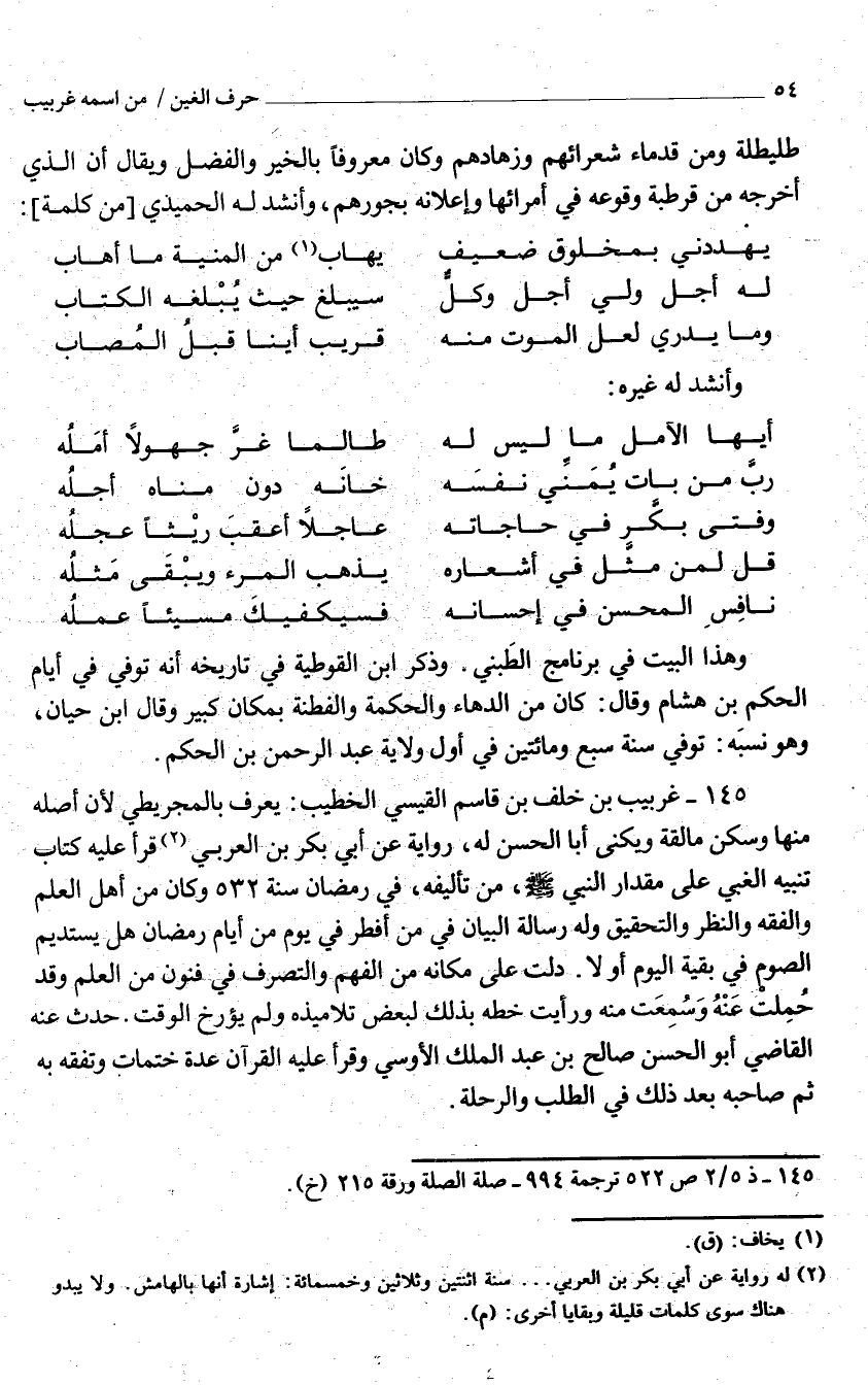 145 - غَرِيب بن خلف بن قَاسم الْقَيْسِي الْخَطِيب يعرف بالمجريطي لِأَن أَصله مِنْهَا وَسكن مالقة ويكنى أَبَا الْحسن لَهُ رِوَايَة عَن أَبِي بكر بن الْعَرَبِيّ قَرَأَ عَلَيْهِ كتاب تَنْبِيه الغبي على مِقْدَار النَّبيّ صَلَّى اللَّهُ عَلَيْهِ وَسَلَّمَ من تأليفه فِي رَمَضَان سنة 532 وَكَانَ من أهل الْعلم وَالْفِقْه وَالنَّظَر وَالتَّحْقِيق وَله رِسَالَة الْبَيَان فِي من أفطر فِي يَوْم من أَيَّام رَمَضَان هَل يستديم الصَّوْم فِي بَقِيَّة الْيَوْم أَو لَا دلّت على مَكَانَهُ من الْفَهم وَالتَّصَرُّف فِي فنون من الْعلم وَقد حملت عَنهُ وَسمعت مِنْهُ وَرَأَيْت خطه بذلك لبَعض تلاميذه وَلم يؤرخ الْوَقْت حدث عَنهُ القَاضِي أَبُو الْحسن صَالح بن عبد الْملك الأوسي وَقَرَأَ عَلَيْهِ الْقُرْآن عدَّة ختمات وتفقه بِهِ ثمَّ صَاحبه بعد ذَلِك فِي الطّلب والرحلة.