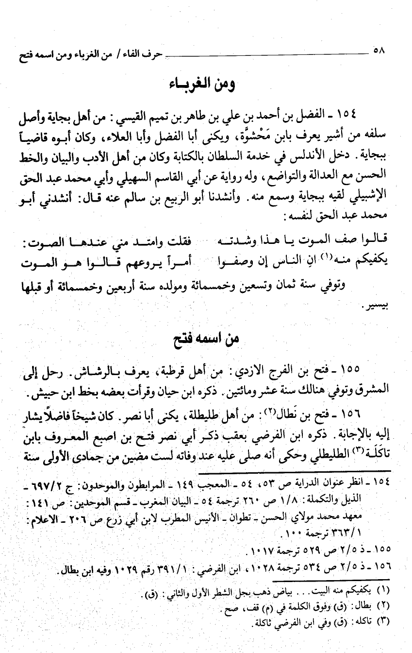 154 - الْفضل بن أَحْمد بن عَليّ بن طَاهِر بن تَمِيم الْقَيْسِي من أهل بجاية وأصل سلفه من أُشير يعرف بِابْن محشوة ويكنى أَبَا الْفضل وَأَبا الْعَلَاء وَكَانَ أَبوهُ قَاضِيا ببجاية دخل الأندلس فِي خدمَة السُّلْطَان بِالْكِتَابَةِ وَكَانَ من أهل الْأَدَب وَالْبَيَان والخط الْحسن مَعَ الْعَدَالَة والتواضع وَله رِوَايَة عَن أبي الْقَاسِم السُّهيْلي وَأبي مُحَمَّد عبد الْحق الإشبيلي لقِيه ببجاية وَسمع مِنْهُ وأنشدنا أَبُو الرّبيع بن سَالم عَنهُ قَالَ أَنْشدني أَبُو مُحَمَّد عبد الْحق لنَفسِهِ