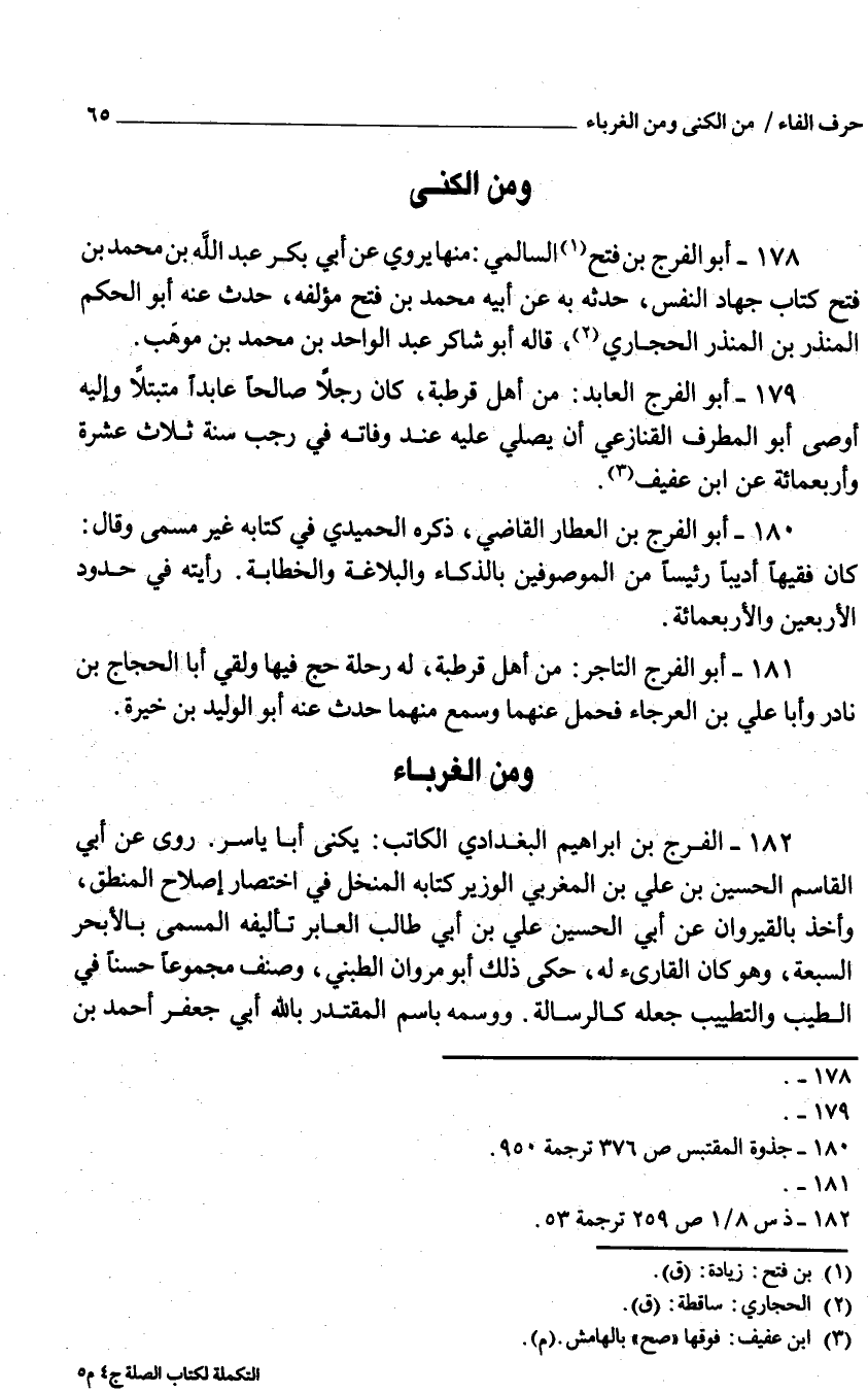179 - أَبُو الْفرج العابد من أهل قرطبة كَانَ رجلا صَالحا عابدا متبتلا وَإِلَيْهِ أوصى أَبُو الْمطرف القنازعي أَن يُصَلِّي عَلَيْهِ عِنْد وَفَاته فِي رَجَب سنة ثَلَاث عشرَة وَأَرْبَعمِائَة عَن ابْن عفيف
