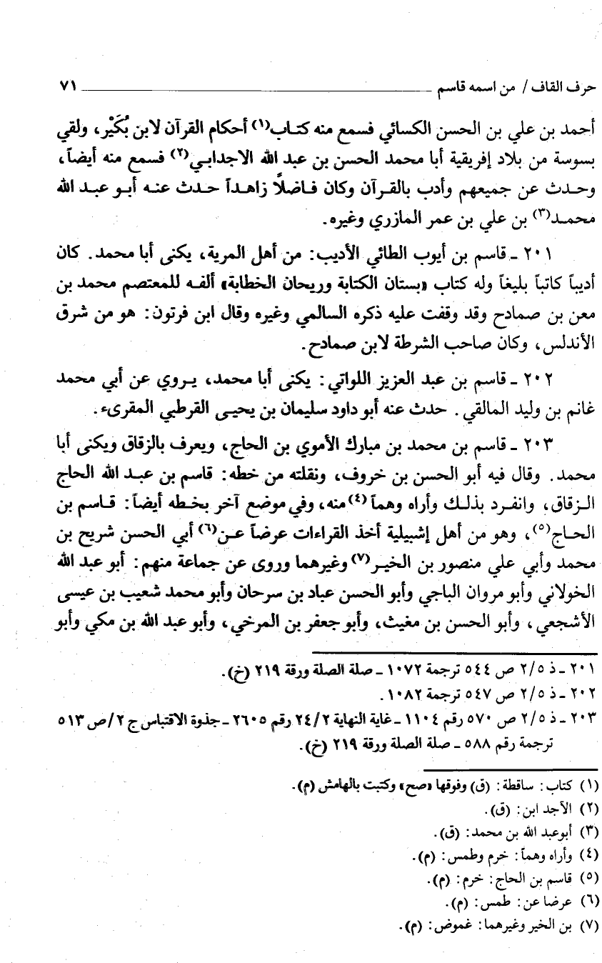 203 - قَاسم بن مُحَمَّد بن مبارك الْأمَوِي بن الْحَاج وَيعرف بالزقاق ويكنى أَبَا مُحَمَّد وَقَالَ فِيهِ أَبُو الْحسن بن خروف ونقلته من خطه قَاسم بن عبد الله الْحَاج الزقاق وَانْفَرَدَ بذلك وَأرَاهُ وهما مِنْهُ وَفِي مَوضِع آخر بِخَطِّهِ أَيْضا قَاسم بن الْحَاج وَهُوَ من أهل إشبيلية أَخذ الْقرَاءَات عرضا عَنْ أبي الْحَسَن شُرَيْح بْن مُحَمَّد وَأبي عَليّ مَنْصُور بن الْخَيْر وَغَيرهمَا وروى عَن جمَاعَة مِنْهُم أَبُو عبد الله الْخَولَانِيّ وَأَبُو مَرْوَان الْبَاجِيّ وَأَبُو الْحسن عباد بن سرحان وَأَبُو مُحَمَّد شُعَيْب بن عِيسَى الْأَشْجَعِيّ وَأَبُو الْحسن بن مغيث وَأَبُو جَعْفَر بن المرخي وَأَبُو عَبْد اللَّه بْن مكي وَأَبُو