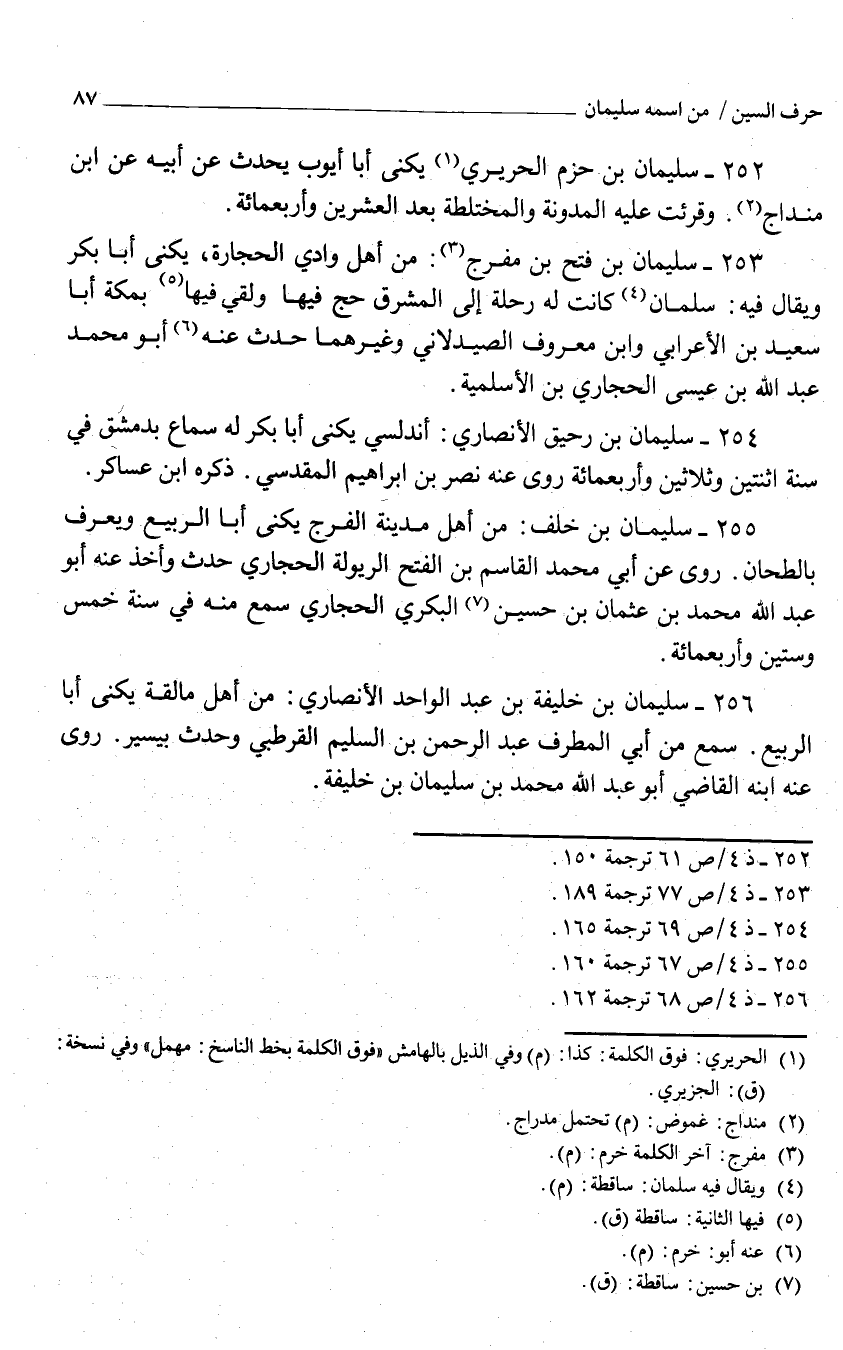 255 - سُلَيْمَان بن خلف من أهل مَدِينَة الْفرج يكنى أَبَا الرّبيع وَيعرف بالطحان روى عَن أبي مُحَمَّد الْقَاسِم بن الْفَتْح الريولة الحجاري حدث وَأخذ عَنهُ أَبُو عبد الله مُحَمَّد بن عُثْمَان بن حُسَيْن الْبكْرِيّ الحجاري سمع مِنْهُ فِي سنة خمس وَسِتِّينَ وَأَرْبَعمِائَة