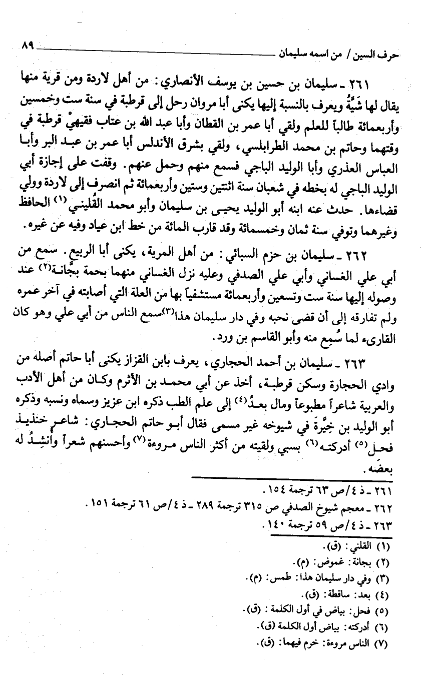 263 - سُلَيْمَان بن أَحْمد الحجاري يعرف بِابْن الْقَزاز يكنى أَبَا حَاتِم أَصله من وَادي الْحِجَارَة وَسكن قرطبة أَخذ عَن أبي مُحَمَّد بن الْأَثْرَم وَكَانَ من أهل الْأَدَب والعربية شَاعِرًا مطبوعا وَمَال بعد إِلَى علم الطِّبّ ذكره ابْن عَزِيز وَسَماهُ وَنسبه وَذكره أَبُو الْوَلِيد بن خيرة فِي شُيُوخه غير مسمي فَقَالَ أَبُو حَاتِم الحجاري شَاعِر خنذيذ فَحل أَدْرَكته بسبي ولقيته من أَكثر النَّاس مُرُوءَة وَأَحْسَنهمْ شعرًا وَأنْشد لَهُ بعضه.