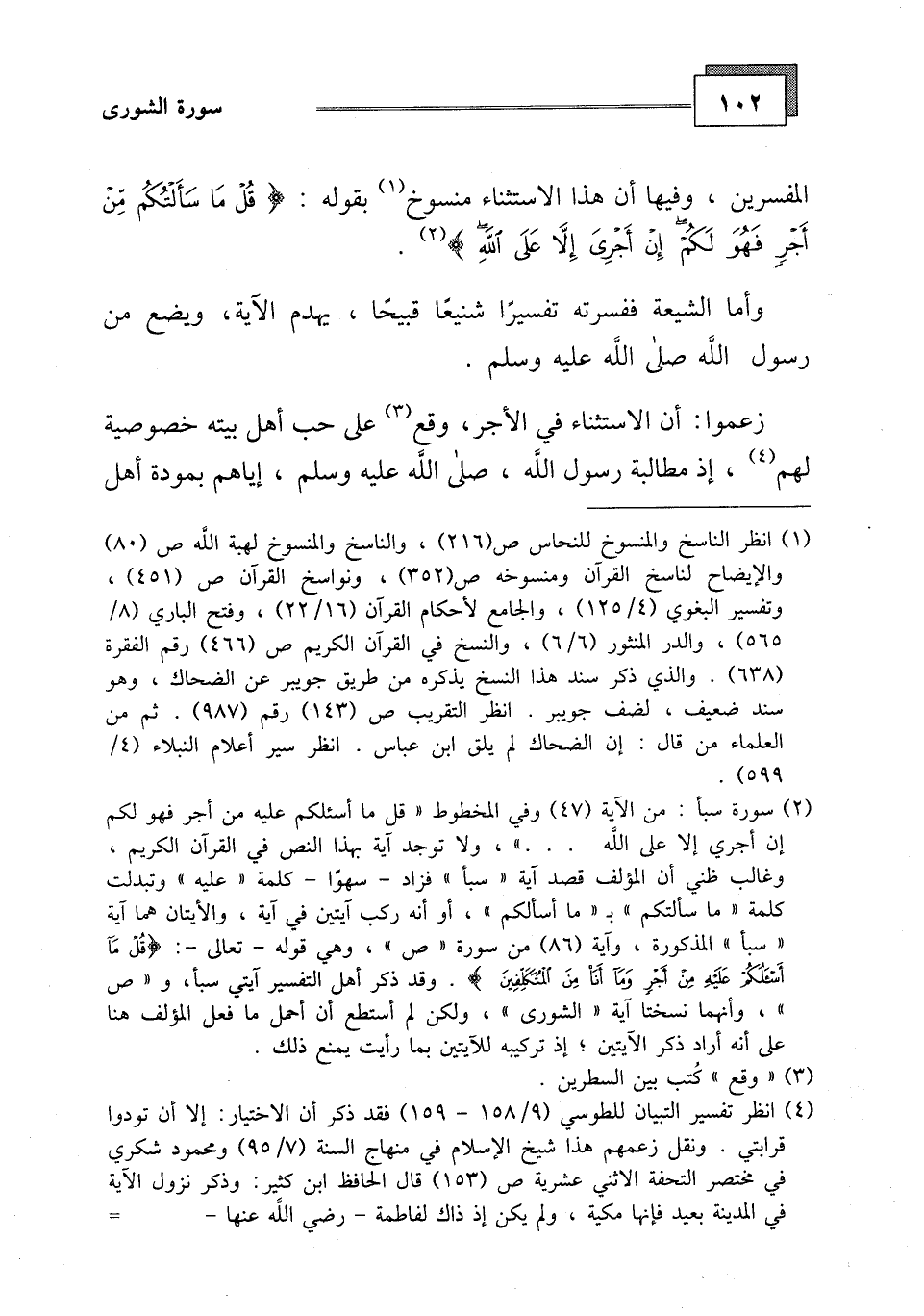 المفسرين، وفيها أن هذا الاستثناء منسوخ بقوله: (قُلْ مَا سَأَلْتُكُمْ مِنْ أَجْرٍ فَهُوَ لَكُمْ إِنْ أَجْرِيَ إِلَّا عَلَى اللَّهِ) .