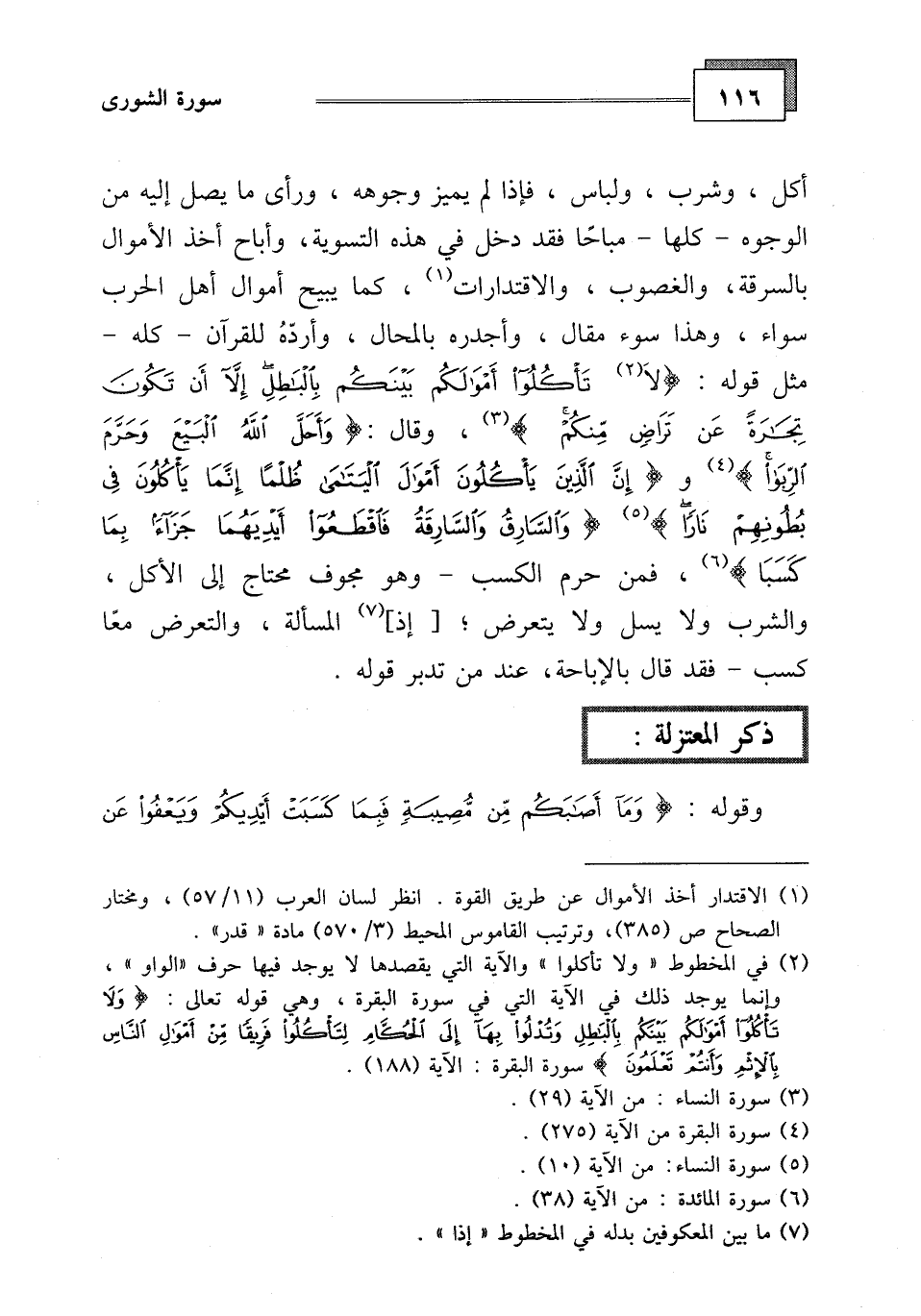 مثل قوله: (لَا تَأْكُلُوا أَمْوَالَكُمْ بَيْنَكُمْ بِالْبَاطِلِ إِلَّا أَنْ تَكُونَ تِجَارَةً عَنْ تَرَاضٍ مِنْكُمْ) ، وقال: (وَأَحَلَّ اللَّهُ الْبَيْعَ وَحَرَّمَ الرِّبَا) و (إِنَّ الَّذِينَ يَأْكُلُونَ أَمْوَالَ الْيَتَامَى ظُلْمًا إِنَّمَا يَأْكُلُونَ فِي بُطُونِهِمْ نَارًا) (وَالسَّارِقُ وَالسَّارِقَةُ فَاقْطَعُوا أَيْدِيَهُمَا جَزَاءً بِمَا كَسَبَا) ، فمن حرم الكسب - وهو مجوف محتاج إلى الأكل، والشرب ولا يسل ولا يتعرض إذ، المسألة، والتعرض معًا