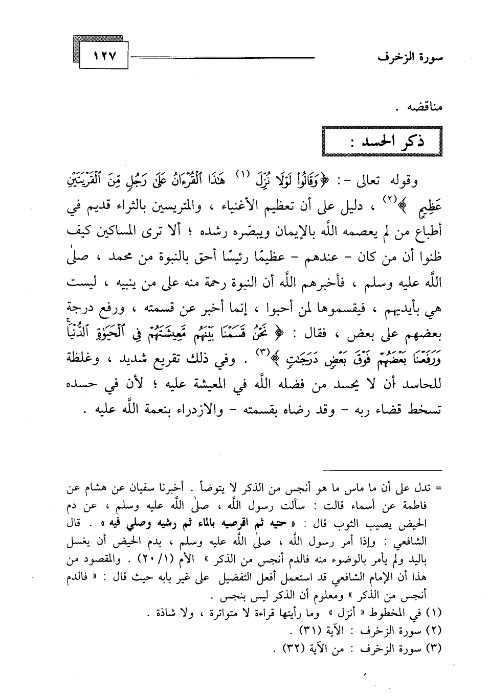 وقوله تعالى -: (وَقَالُوا لَوْلَا نُزِّلَ هَذَا الْقُرْآنُ عَلَى رَجُلٍ مِنَ الْقَرْيَتَيْنِ عَظِيمٍ (31) ، دليل على أن تعظيم الأغنياء، والمتريسين بالثراء قديم في