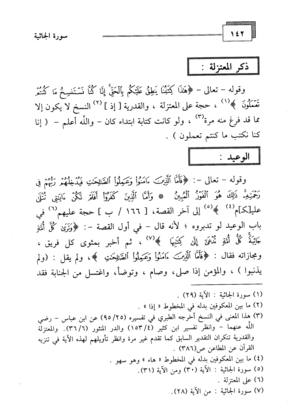 إلى آخر القصة، حجة عليهم في بالب الوعيد لو تدبروه، لأنه قال - في أول القصة -: (وَتَرَى كُلَّ أُمَّةٍ جَاثِيَةً كُلُّ أُمَّةٍ تُدْعَى إِلَى كِتَابِهَا) ، ثم أخبر بمثوى كل فريق، ومجازاته فقال: ((فَأَمَّا الَّذِينَ آمَنُوا وَعَمِلُوا الصَّالِحَاتِ) ، ولم يقل: (ولم يذنبوا) ، والمؤمن إذا صلى، وصام، وتوضأ، واغتسل من الجنابة فقد