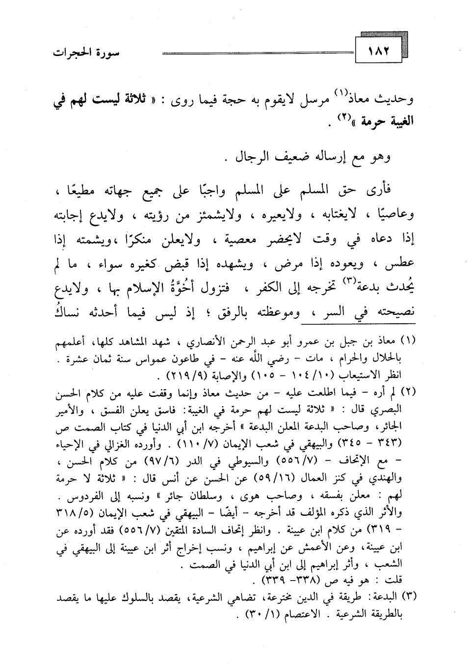 وحديث معاذ مرسل لا يقوم به حجة فيا روى: " ثلائة ليست لهم في الغيبة حرمة "