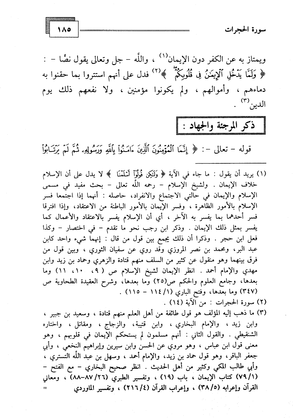 قوده - تعالى -: (إِنَّمَا الْمُؤْمِنُونَ الَّذِينَ آمَنُوا بِاللَّهِ وَرَسُولِهِ ثُمَّ لَمْ يَرْتَابُوا وَجَاهَدُوا بِأَمْوَالِهِمْ وَأَنْفُسِهِمْ فِي سَبِيلِ اللَّهِ أُولَئِكَ هُمُ الصَّادِقُونَ (15)