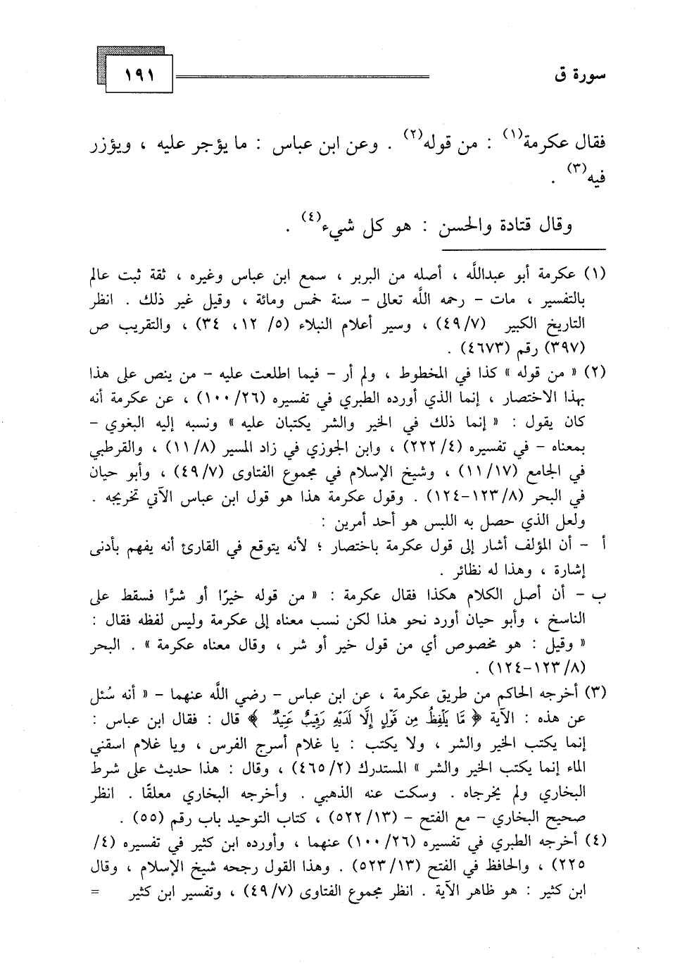 فقال عكرمة: من قوله. وعن ابن عباس ما يؤجر عليه، ويؤزر