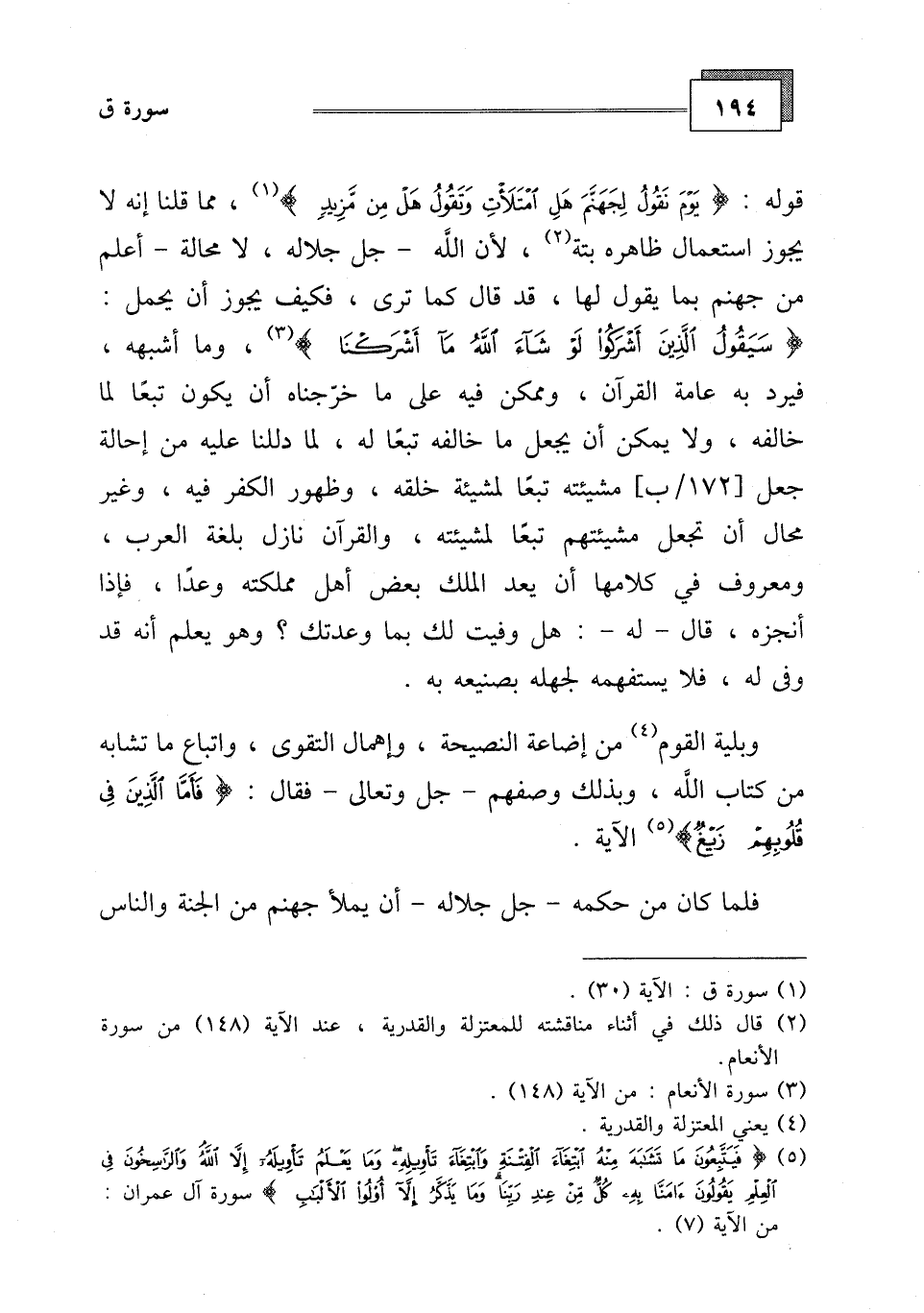 مما قلنا إنه لا يجوز استعمال ظاهره بتة، لأن الله - جل جلاله، لا محالة - أعلم من جهنم بما يقول لها، قد قال كما ترى، فكيف يجوز أن يحمل: