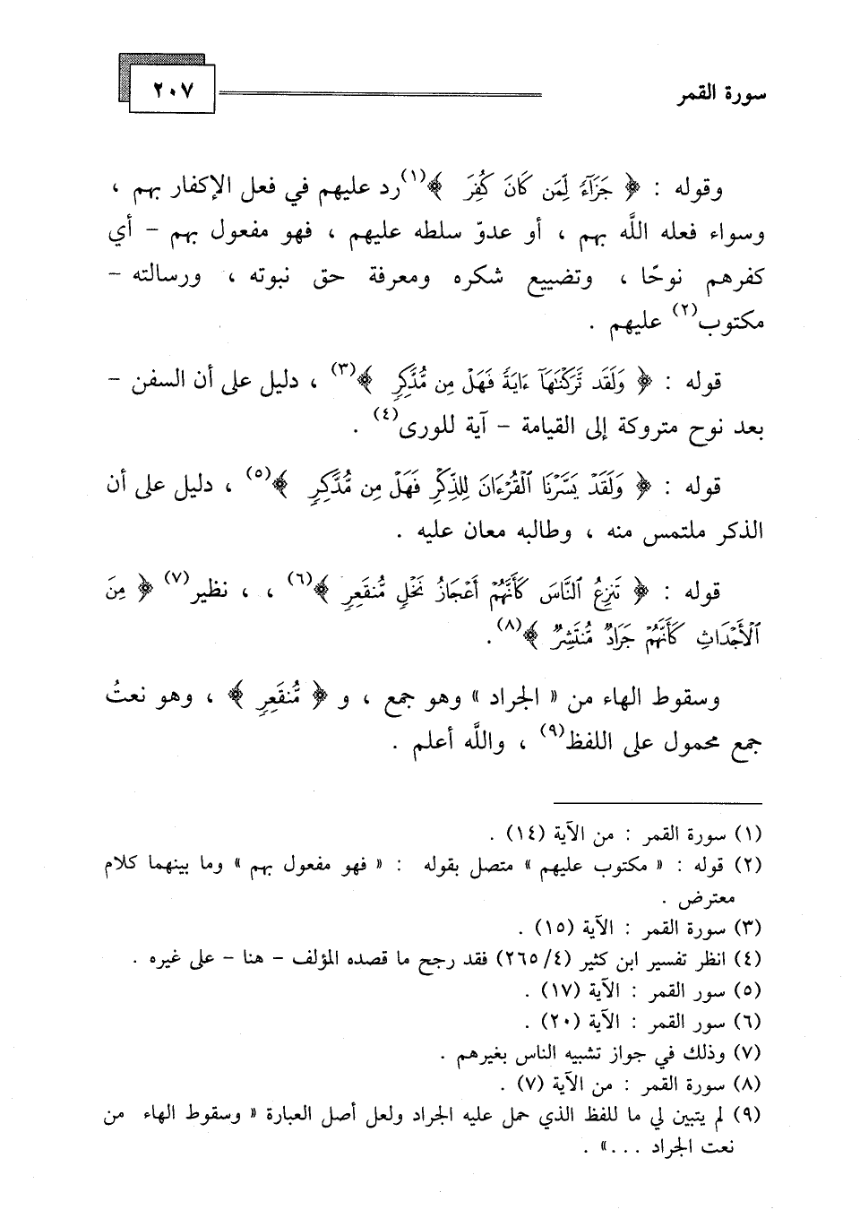 وسقوط الهاء من " الجَرَادٌ " وهو جمع، و (مُنْقَعِرٍ) ، وهو نعتُ