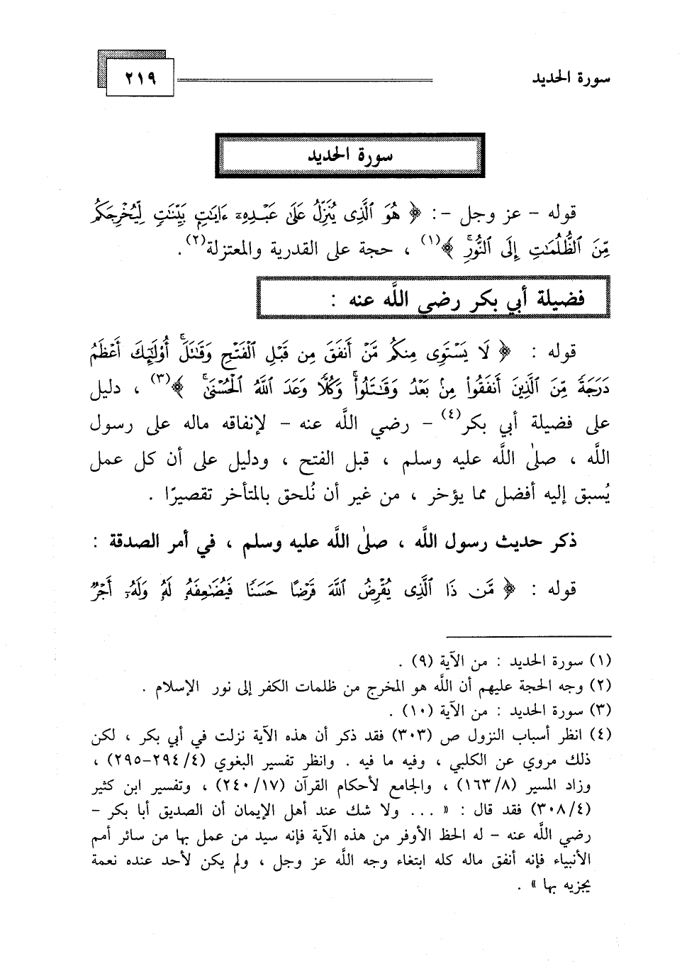 قوله: (لَا يَسْتَوِي مِنْكُمْ مَنْ أَنْفَقَ مِنْ قَبْلِ الْفَتْحِ وَقَاتَلَ أُولَئِكَ أَعْظَمُ دَرَجَةً مِنَ الَّذِينَ أَنْفَقُوا مِنْ بَعْدُ وَقَاتَلُوا وَكُلًّا وَعَدَ اللَّهُ الْحُسْنَى)