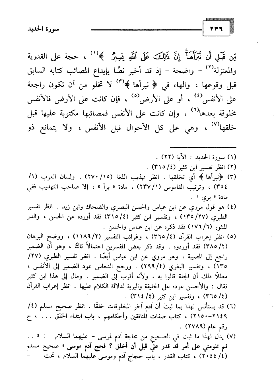 حجة على القدرية والمعتزلة واضحة - إذ قد أخبر نصًّا يإيداع المصائب كتابه السابق قبل وقوعها، والهاء في (نَبْرَأَهَا) لا تخلو من أن تكون راجعة