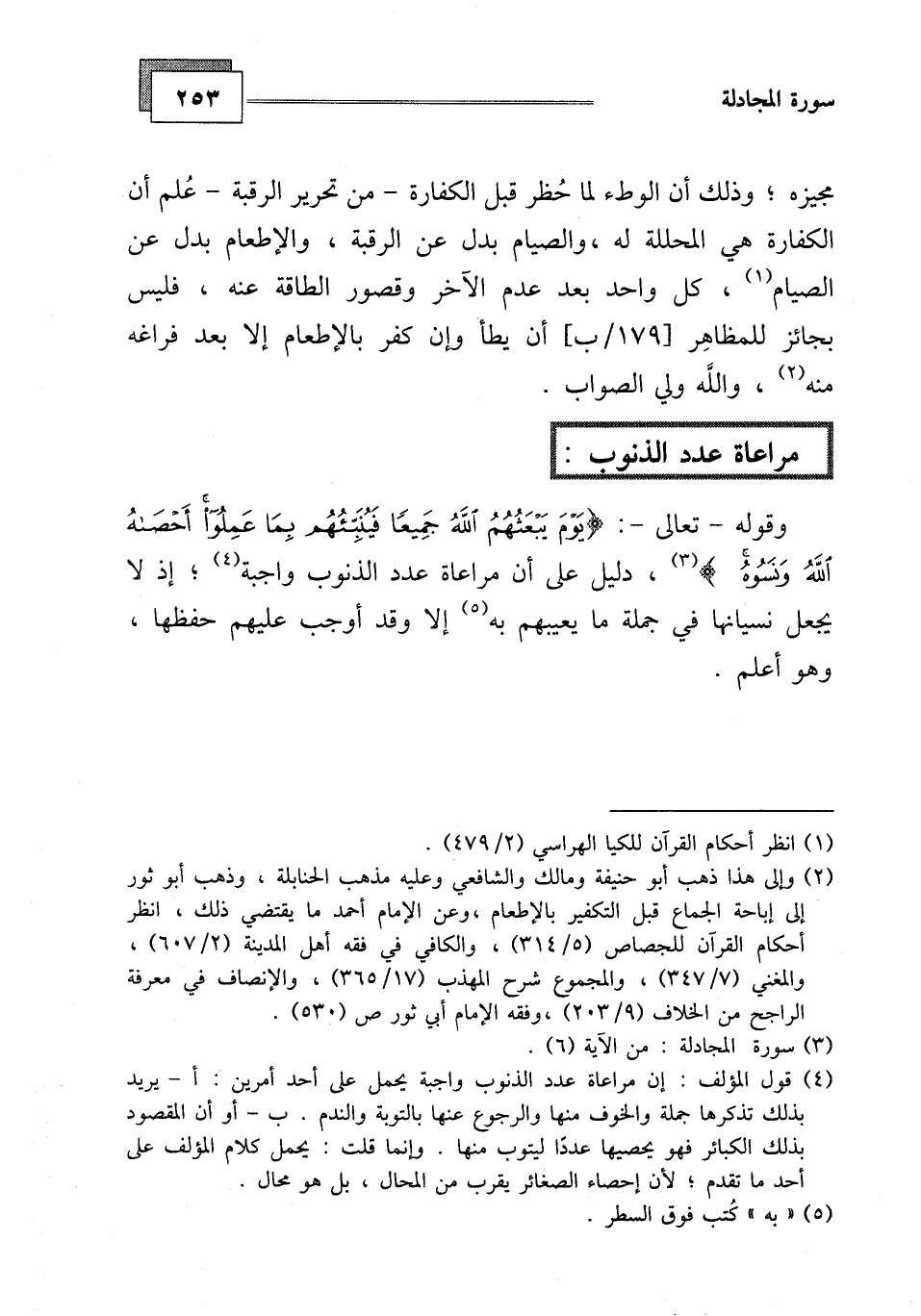 وقوله - تعالى -: (يَوْمَ يَبْعَثُهُمُ اللَّهُ جَمِيعًا فَيُنَبِّئُهُمْ بِمَا عَمِلُوا أَحْصَاهُ اللَّهُ) دليل على أن مراعاة عدد الذنوب واجبة، إذ لا يجعل نسيانها في جملة ما يعيبهم به إلا وقد أوجب عليهم حفظها، وهو أعلم.