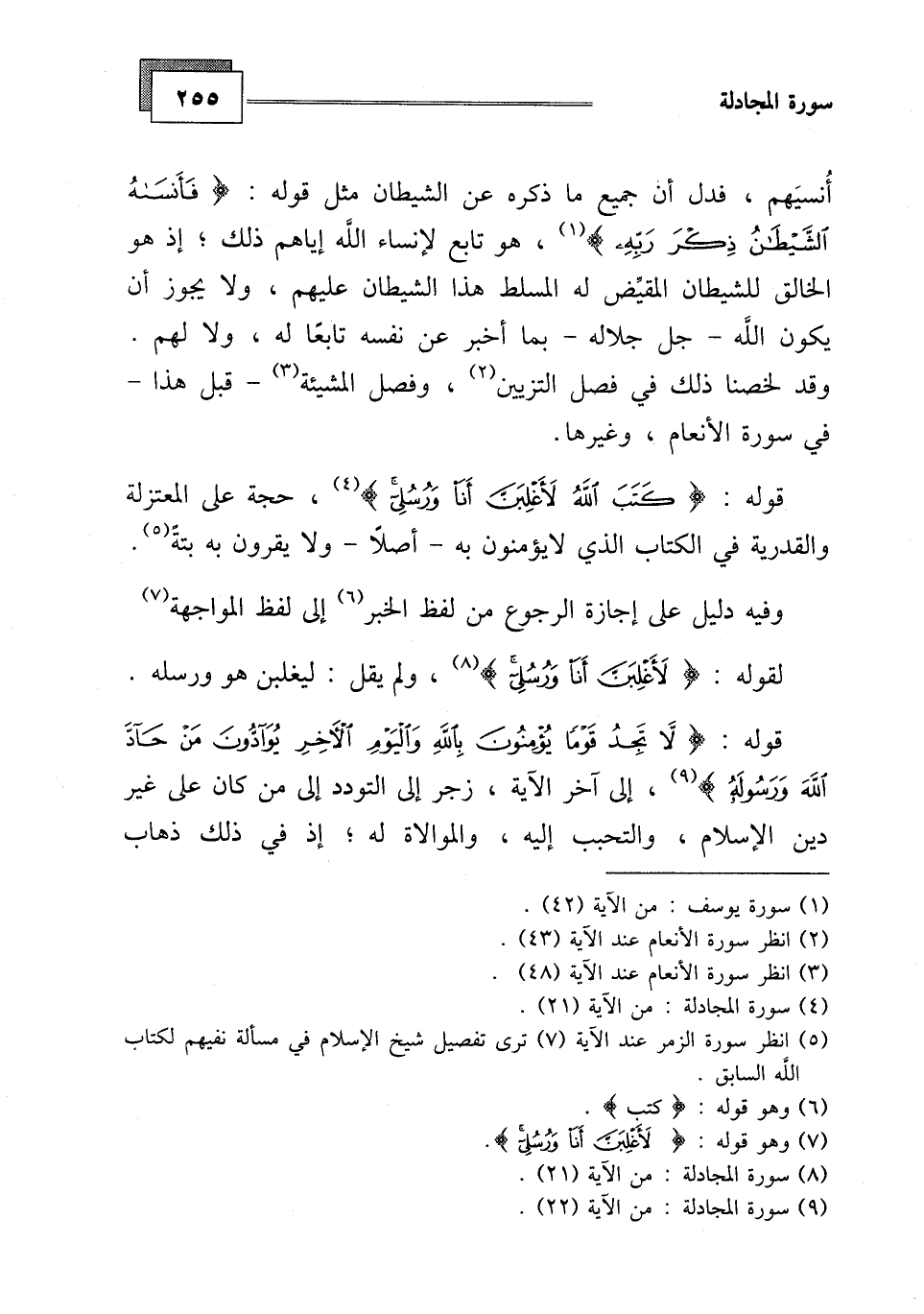 أُنسيَهم، فدل أن جميع ما ذكره عن الشيطان مثل قوله: (فَأَنْسَاهُ الشَّيْطَانُ ذِكْرَ رَبِّهِ) ، هو تابع لإنساء الله إياهم ذلك، إذ هو الخالق للشيطان المقيِّض له المسلط هذا الشيطان عليهم، ولا يجوز أن يكون الله - جل جلاله - بما أخبر عن نفسه تابعًا له، ولا لهم.