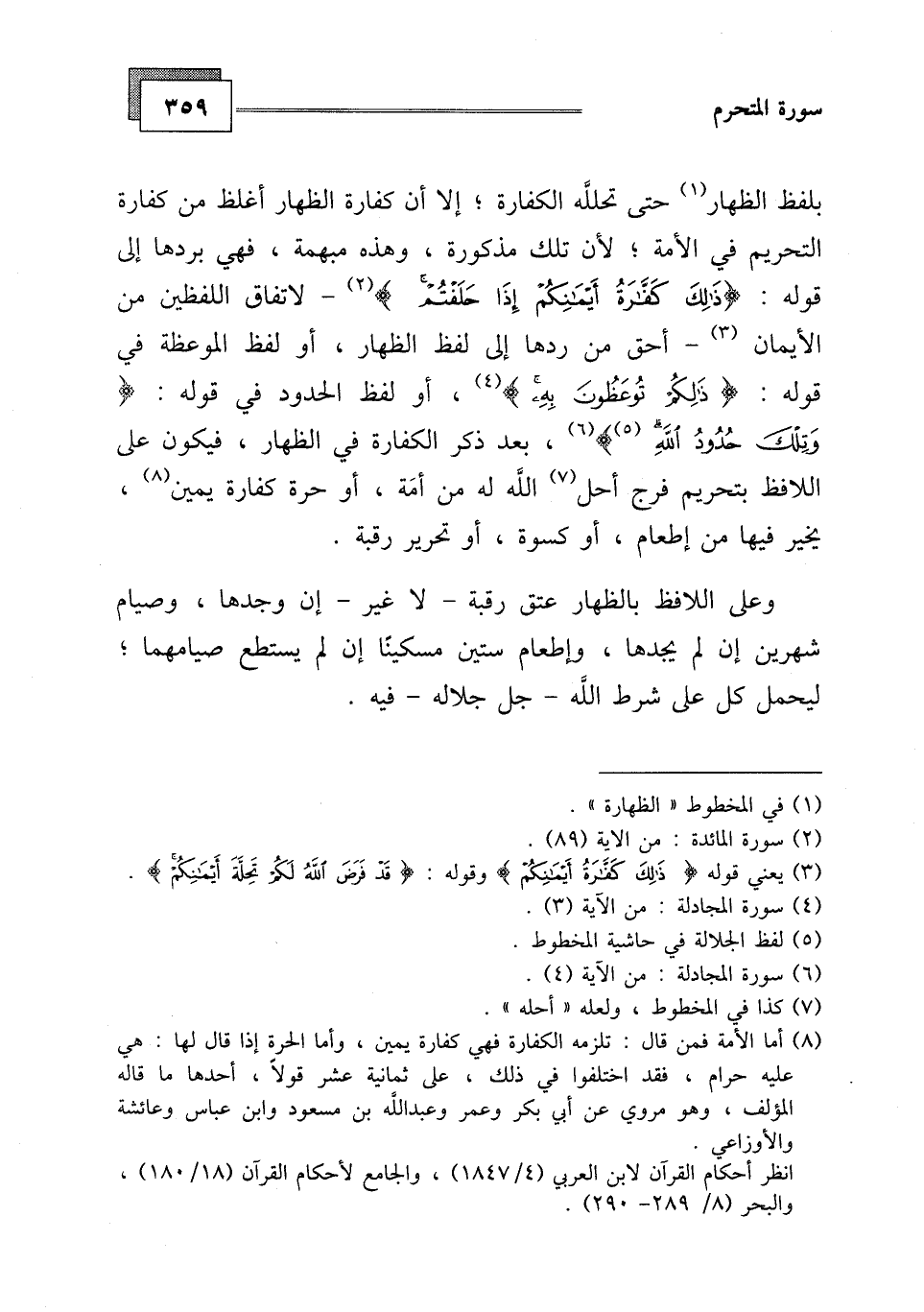 قوله: (ذَلِكُمْ تُوعَظُونَ بِهِ) ، أو لفظ الحدود في قوله: (وَتِلْكَ حُدُودُ اللَّهِ) ، بعد ذكر الكفارة في الظهار، فيكون على اللافظ بتحريم فرج أحل الله له من أمَة، أو حرة كفارة يمين، يخير فيها من إطعام، أو كسوة، أو تحرير رقبة.