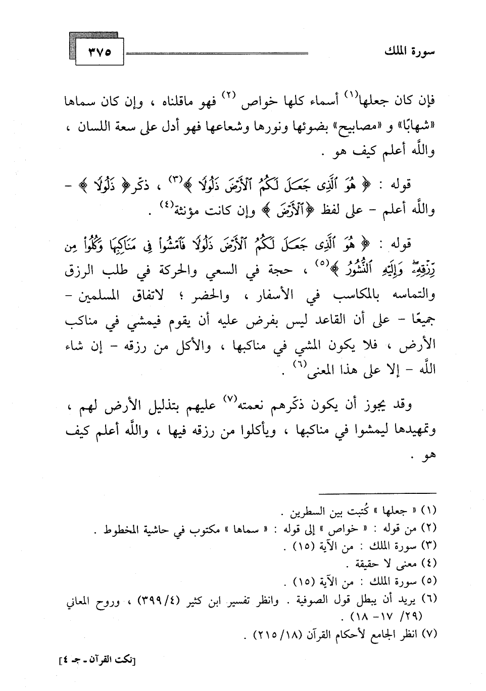 قوله: (هُوَ الَّذِي جَعَلَ لَكُمُ الْأَرْضَ ذَلُولًا فَامْشُوا فِي مَنَاكِبِهَا وَكُلُوا مِنْ رِزْقِهِ وَإِلَيْهِ النُّشُورُ (15) .
