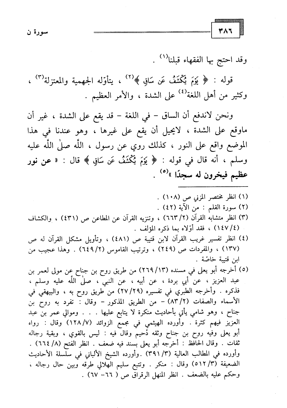 وسلم، أنه قال في قوله: (يَوْمَ يُكْشَفُ عَنْ سَاقٍ) قال: " عن نور