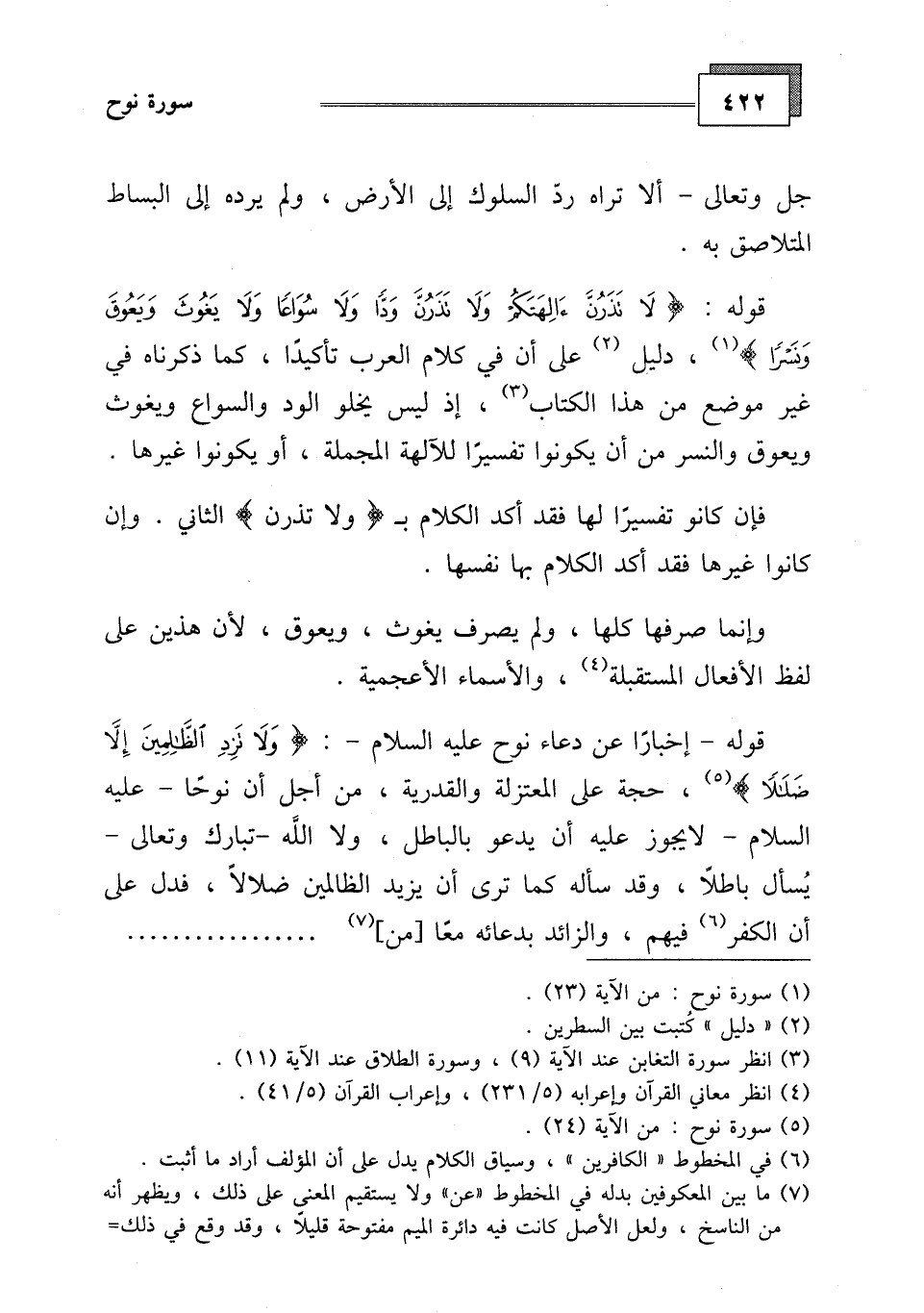 دليل على أن في كلام العرب تأكيدًا، كما ذكرناه في غير موضع من هذا الكتاب، إذ ليس يخلو الود والسواع ويغوث ويعوق والنسر من أن يكونوا تفسيرًا للآلهة المجملة، أو يكونوا غيرها.