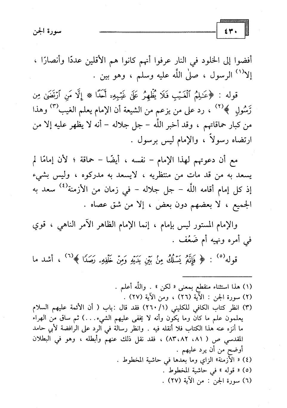 رد على من يزعم من الشيعة أن الإمام يعلم الغيب وهذا من كبار حماقاتهم، وقد أخبر الله - جل جلاله - أنه لا يظهر عليه إلا من ارتضاه رسولاً، والإمام ليس برسول.