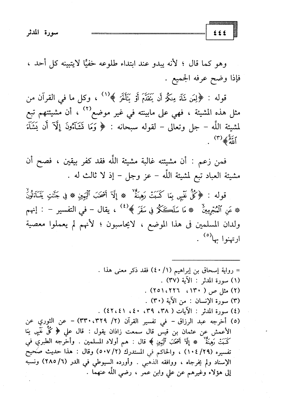 قوله: (كُلُّ نَفْسٍ بِمَا كَسَبَتْ رَهِينَةٌ (38) إِلَّا أَصْحَابَ الْيَمِينِ (39) فِي جَنَّاتٍ يَتَسَاءَلُونَ (40) عَنِ الْمُجْرِمِينَ (41) مَا سَلَكَكُمْ فِي سَقَرَ (42) .