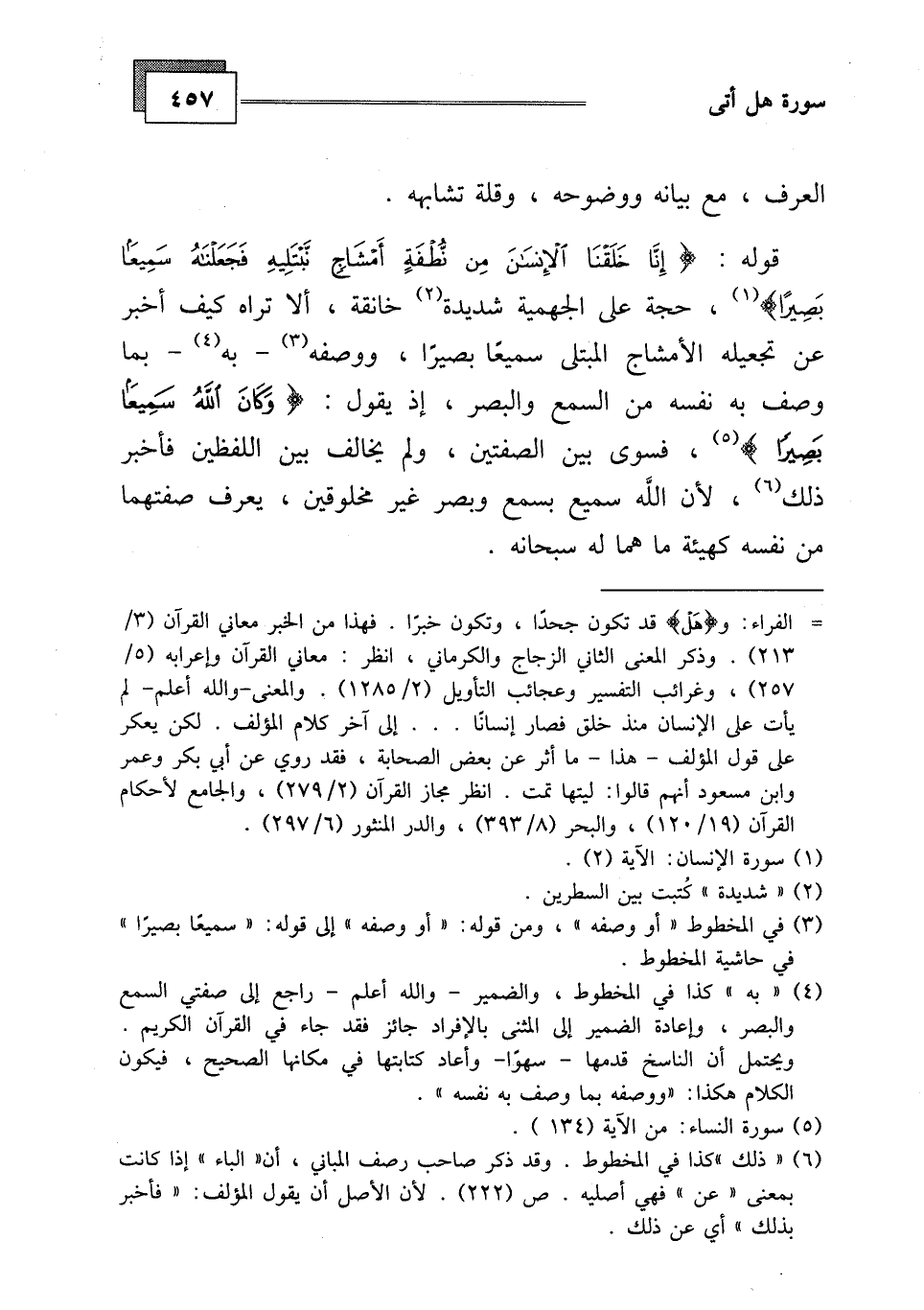 قوله: (إِنَّا خَلَقْنَا الْإِنْسَانَ مِنْ نُطْفَةٍ أَمْشَاجٍ نَبْتَلِيهِ فَجَعَلْنَاهُ سَمِيعًا بَصِيرًا (2) حجة على الجهمية شديدة خانقة، ألا تراه كيف أخبر
