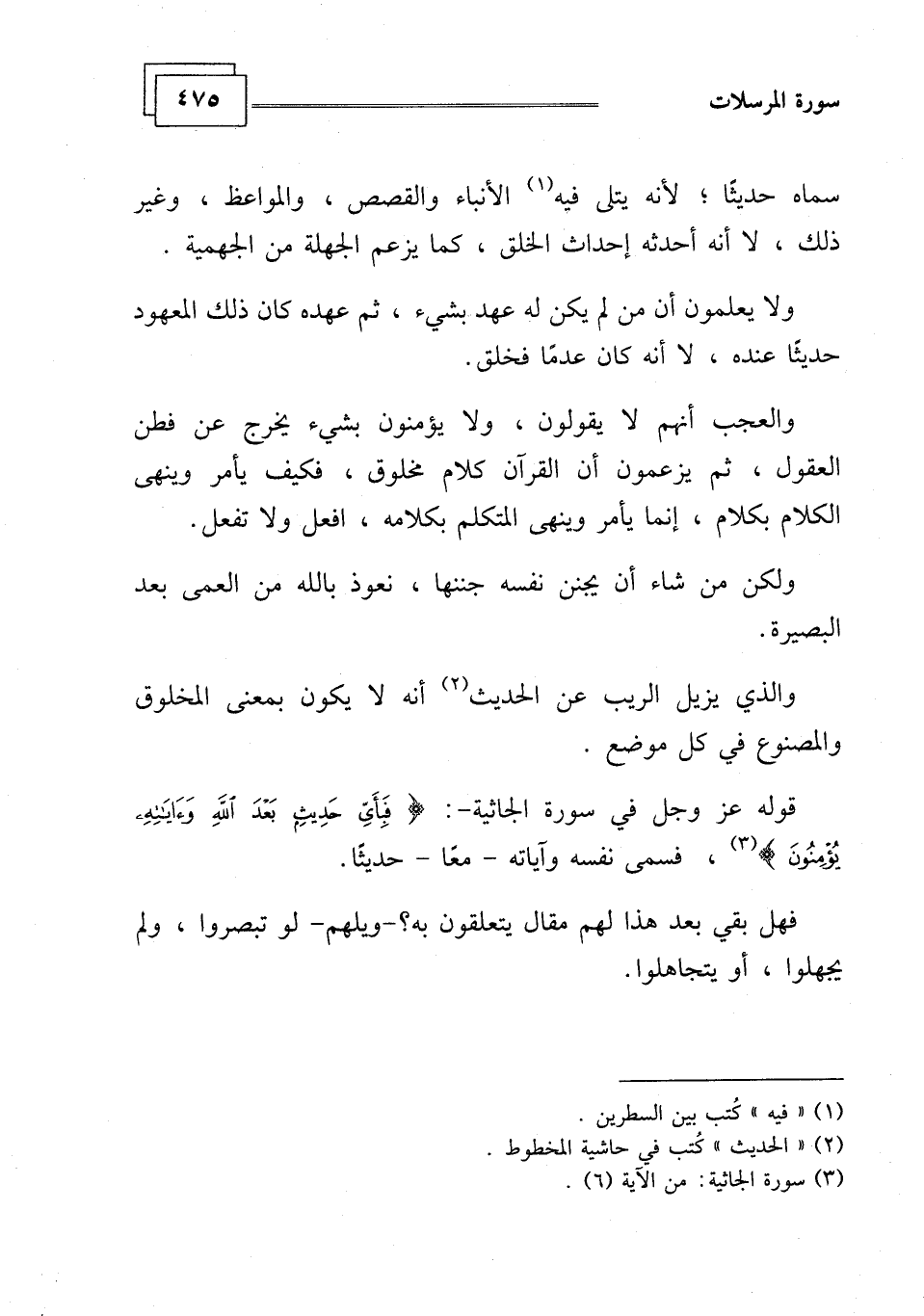 قوله عز وجل في سورة الجاثية -: (فَبِأَيِّ حَدِيثٍ بَعْدَ اللَّهِ وَآيَاتِهِ يُؤْمِنُونَ (6) ، فسمى نفسه وآياته - معًا - حديثًا.
