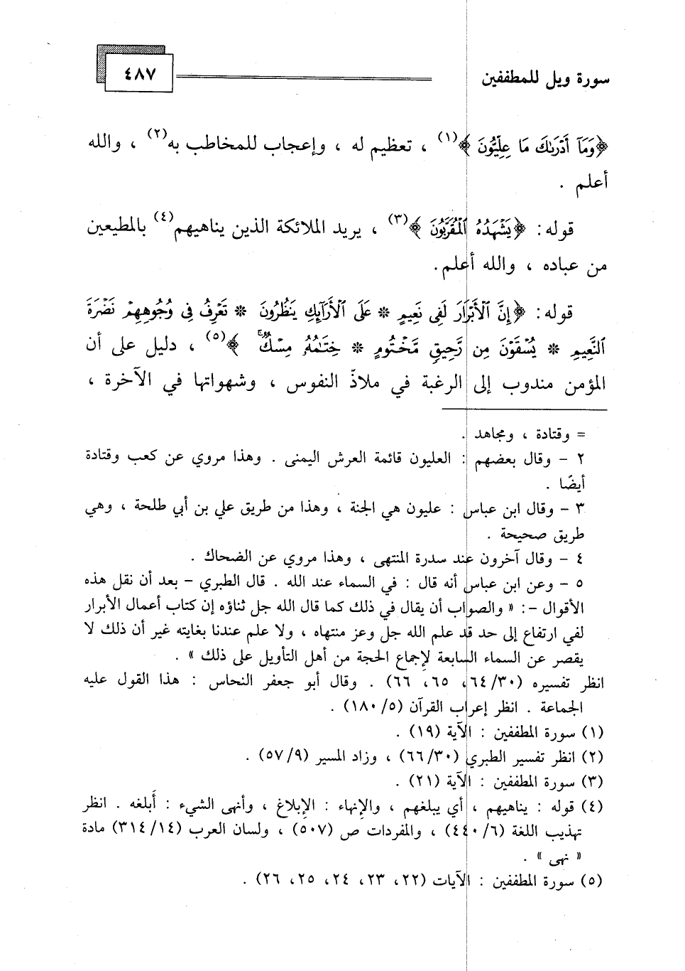 قوله: (إِنَّ الْأَبْرَارَ لَفِي نَعِيمٍ (22) عَلَى الْأَرَائِكِ يَنْظُرُونَ (23) تَعْرِفُ فِي وُجُوهِهِمْ نَضْرَةَ النَّعِيمِ (24) يُسْقَوْنَ مِنْ رَحِيقٍ مَخْتُومٍ (25) خِتَامُهُ مِسْكٌ) . دليل على أن المؤمن مندوب إلى الرغبة في ملاذّ النفوس، وشهواتها في الآخرة