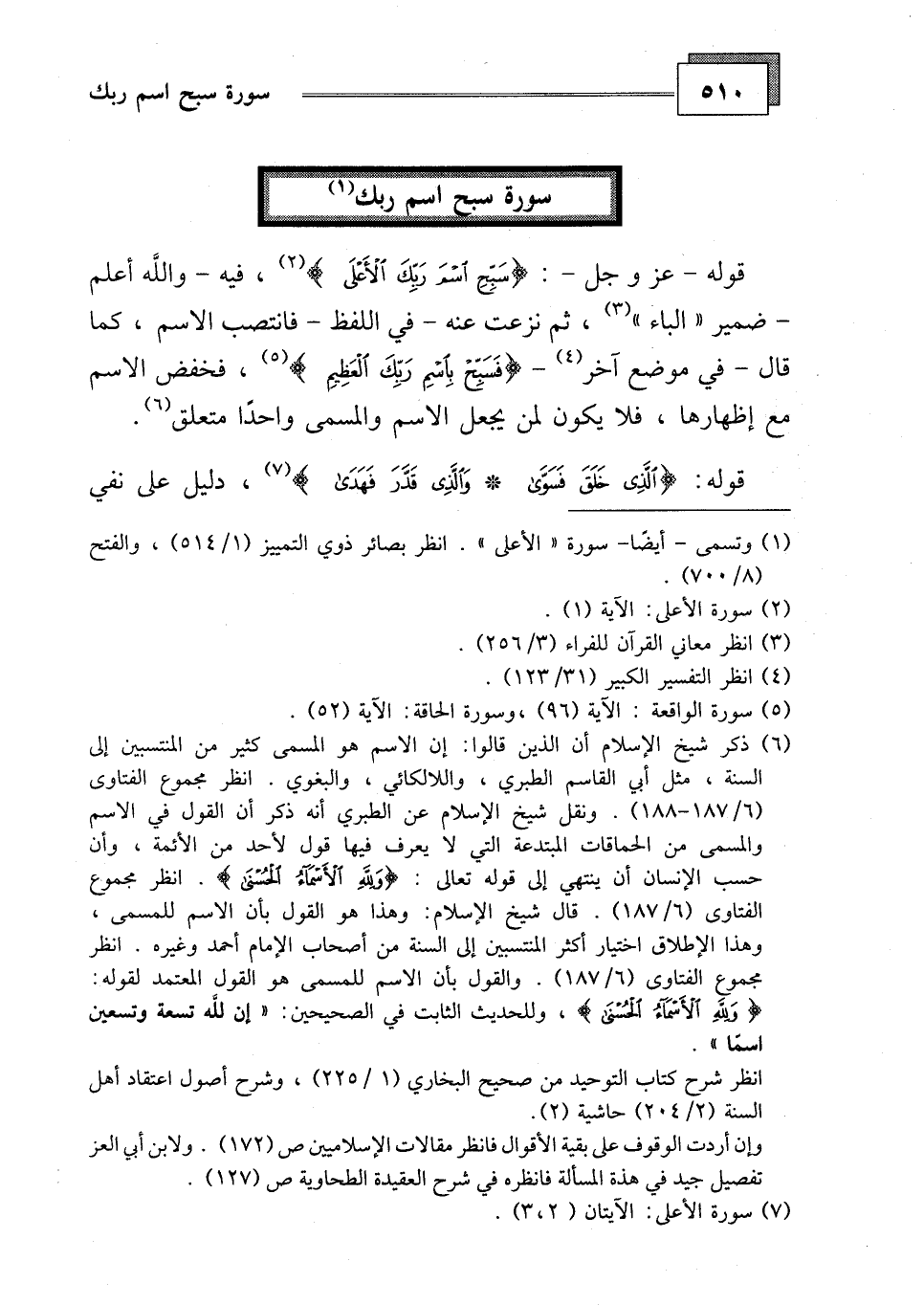 قوله - عز وجل -: (سَبِّحِ اسْمَ رَبِّكَ الْأَعْلَى (1) .