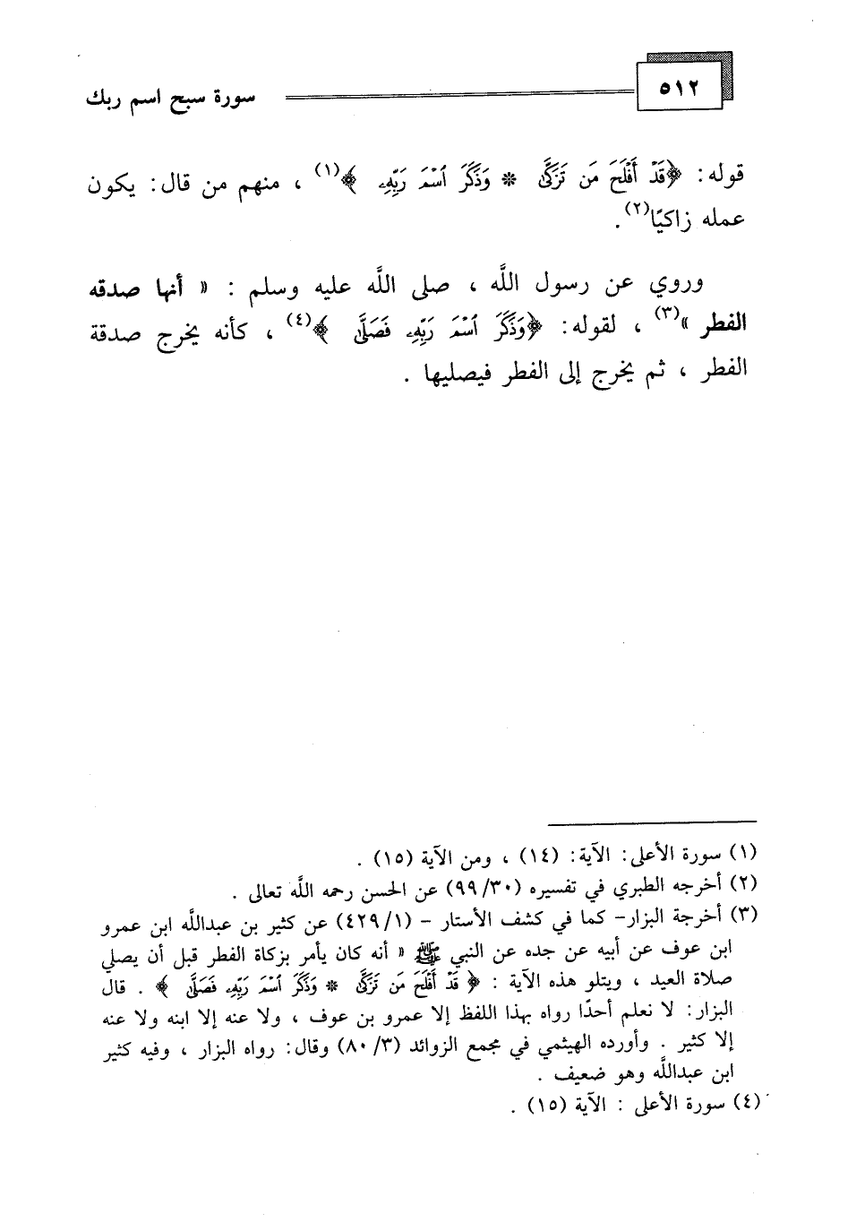 وروي عن رسول الله، صلى الله عليه وسلم: " أنها صدقة الفطر "، لقوله (وَذَكَرَ اسْمَ رَبِّهِ فَصَلَّى (15) ، كأنه يخرج صدقة