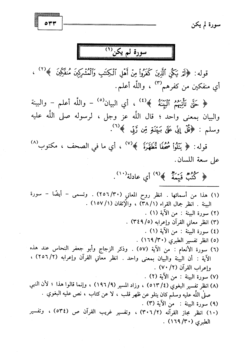 قوله: (لَمْ يَكُنِ الَّذِينَ كَفَرُوا مِنْ أَهْلِ الْكِتَابِ وَالْمُشْرِكِينَ مُنْفَكِّينَ)