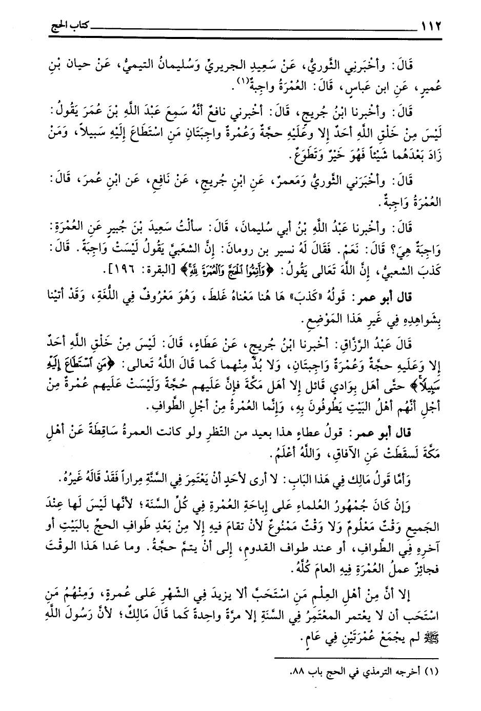 قَالَ وَأَخْبَرَنِي الثَّوْرِيُّ ومعمر عن بن جريج عن نافع عن بن عُمَرَ قَالَ الْعُمْرَةُ وَاجِبَةٌ قَالَ وَأَخْبَرْنَا عَبْدُ اللَّهِ بْنُ أَبِي سُلَيْمَانَ قَالَ سَأَلْتُ سَعِيدَ بْنَ جُبَيْرٍ عَنِ الْعُمْرَةِ وَاجِبَةٌ هِيَ قَالَ نَعَمْ فَقَالَ لَهُ نُسَيْرُ بْنُ رُومَانَ إِنَّ الشَّعْبِيَّ يَقُولُ لَيْسَتْ وَاجِبَةً قَالَ كَذَبَ الشَّعْبِيُّ إِنَّ اللَّهَ تَعَالَى يَقُولُ (وَأَتِمُّوا الْحَجَّ وَالْعُمْرَةَ لِلَّهِ) الْبَقَرَةِ 196