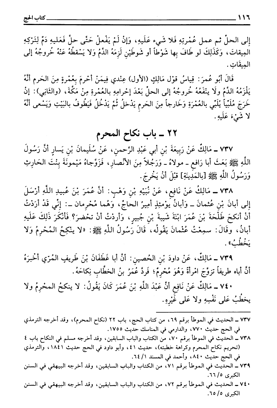 740 - مَالِكٌ عَنْ نَافِعٍ أَنَّ عَبْدَ اللَّهِ بْنَ عُمَرَ كَانَ يَقُولُ لَا يَنْكِحُ الْمُحَرِمُ وَلَا يَخْطُبُ عَلَى نَفْسِهِ وَلَا عَلَى غيره