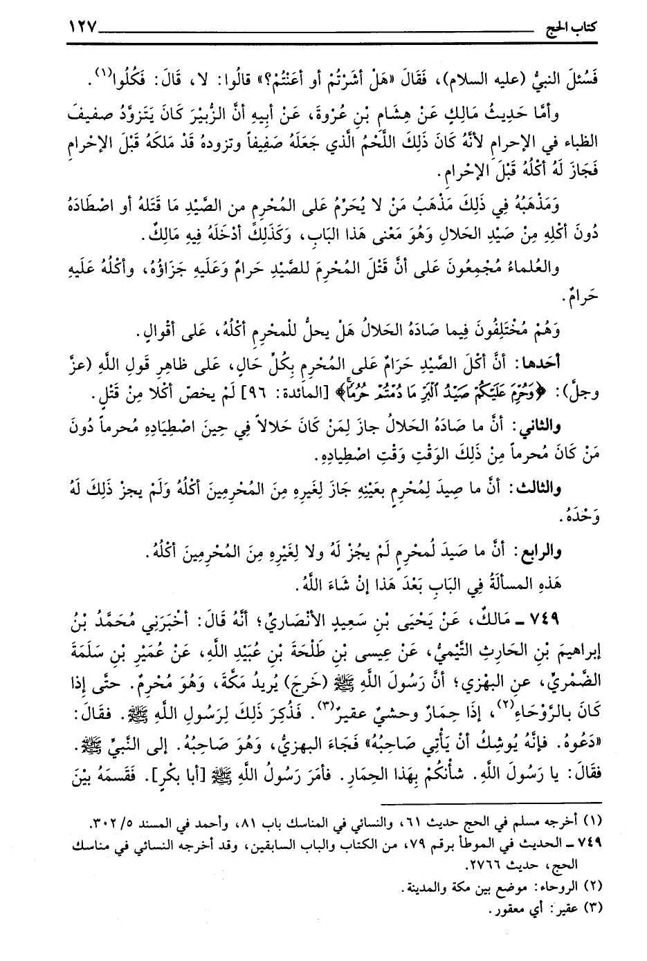 749 - مَالِكٌ عَنْ يَحْيَى بْنِ سَعِيدٍ الْأَنْصَارِيِّ أَنَّهُ قَالَ أَخْبَرَنِي مُحَمَّدِ بْنِ إِبْرَاهِيمَ بْنِ الْحَارِثِ التَّيْمِيِّ عَنْ عِيسَى بْنِ طَلْحَةَ بْنِ عُبَيْدِ اللَّهِ عَنْ عُمَيْرِ بْنِ سَلَمَةَ الضَّمَرِيِّ عَنِ الْبَهْزِيِّ أَنَّ رَسُولَ اللَّهِ صَلَّى اللَّهُ عَلَيْهِ وَسَلَّمَ (خَرَجَ) يُرِيدُ مَكَّةَ وَهُوَ مُحْرِمٌ حَتَّى إِذَا كَانَ بِالرَّوْحَاءِ إِذَا حِمَارٌ وَحْشِيٌّ عَقِيرٌ فَذُكِرَ ذَلِكَ لِرَسُولِ اللَّهِ صَلَّى اللَّهُ عَلَيْهِ وَسَلَّمَ فَقَالَ دَعُوهُ فَإِنَّهُ يُوشِكُ أَنْ يَأْتِيَ صَاحِبُهُ فَجَاءَ الْبَهْزِيُّ وَهُوَ صَاحِبُهُ إِلَى النَّبِيِّ صَلَّى اللَّهُ عَلَيْهِ وَسَلَّمَ فَقَالَ يَا رَسُولَ اللَّهِ شَأْنَكُمْ بِهَذَا الْحِمَارِ فَأَمَرَ رَسُولُ اللَّهِ صَلَّى اللَّهُ عَلَيْهِ وَسَلَّمَ أَبَا بَكْرٍ فَقَسَّمَهُ بَيْنَ