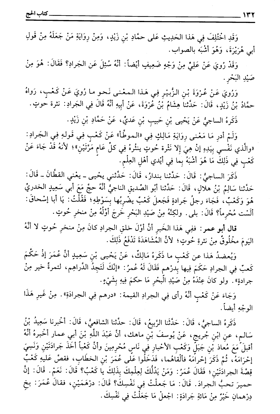 ذَكَرَهُ السَّاجِيُّ قَالَ حَدَّثَنَا الرَّبِيعُ قَالَ حَدَّثَنَا الشَّافِعِيُّ قَالَ أَخْبَرَنَا سَعِيدُ بن سالم عن بن جُرَيْجٍ عَنْ يُوسُفَ بْنِ مَاهَكَ أَنَّ عَبْدَ اللَّهِ بْنَ أَبِي عَمَّارٍ أَخْبَرَهُ أَنَّهُ أَقْبَلَ مَعَ مُعَاذِ بْنِ جَبَلٍ وَكَعْبِ الْأَحْبَارِ فِي ناس محرمين وأن كعبا أَخَذَ جَرَادَتَيْنِ وَنَسِيَ إِحْرَامَهُ ثُمَّ ذَكَرَ إِحْرَامَهُ فَأَلْقَاهُمَا فَدَخَلُوا عَلَى عُمَرَ بْنِ الْخَطَّابِ فَقَصَّ عَلَيْهِ كَعْبٌ قِصَّةَ الْجَرَادَتَيْنِ فَقَالَ عُمَرُ وَمَنْ يَدُلُّكَ لِعِلْمِكَ بِذَلِكَ يَا كَعْبُ قَالَ نَعَمْ قَالَ إِنَّ حِمْيَرَ تُحِبُّ الْجَرَادَ قَالَ مَا جَعَلْتُ فِي نَفْسِكَ قَالَ دِرْهَمَيْنِ فَقَالَ عُمَرُ بَخٍ دِرْهَمَانِ خَيْرٌ مِنْ مَائَةِ جَرَادَةٍ اجْعَلْ مَا جَعَلْتَ فِي نَفْسِكَ