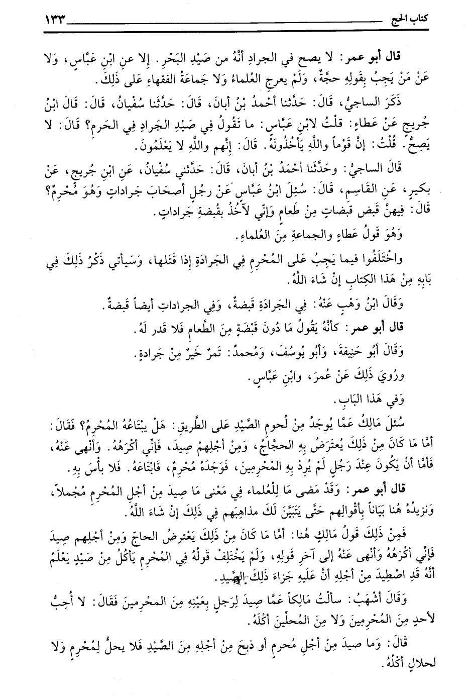 قَالَ السَّاجِيُّ وَحَدَّثَنَا أَحْمَدُ بْنُ أَبَانٍ قَالَ حدثني سفيان عن بن جُرَيْجٍ عَنْ بُكَيْرٍ عَنِ الْقَاسِمِ قَالَ سُئِلَ بن عَبَّاسٍ عَنْ رَجُلٍ أَصَابَ جَرَادَاتٍ وَهُوَ مُحْرِمٌ قَالَ فِيهِنَّ قَبْضُ قَبَضَاتٍ مِنْ طَعَامٍ وَإِنِّي لِآخُذُ بِقَبْضَةِ جَرَادَاتٍ