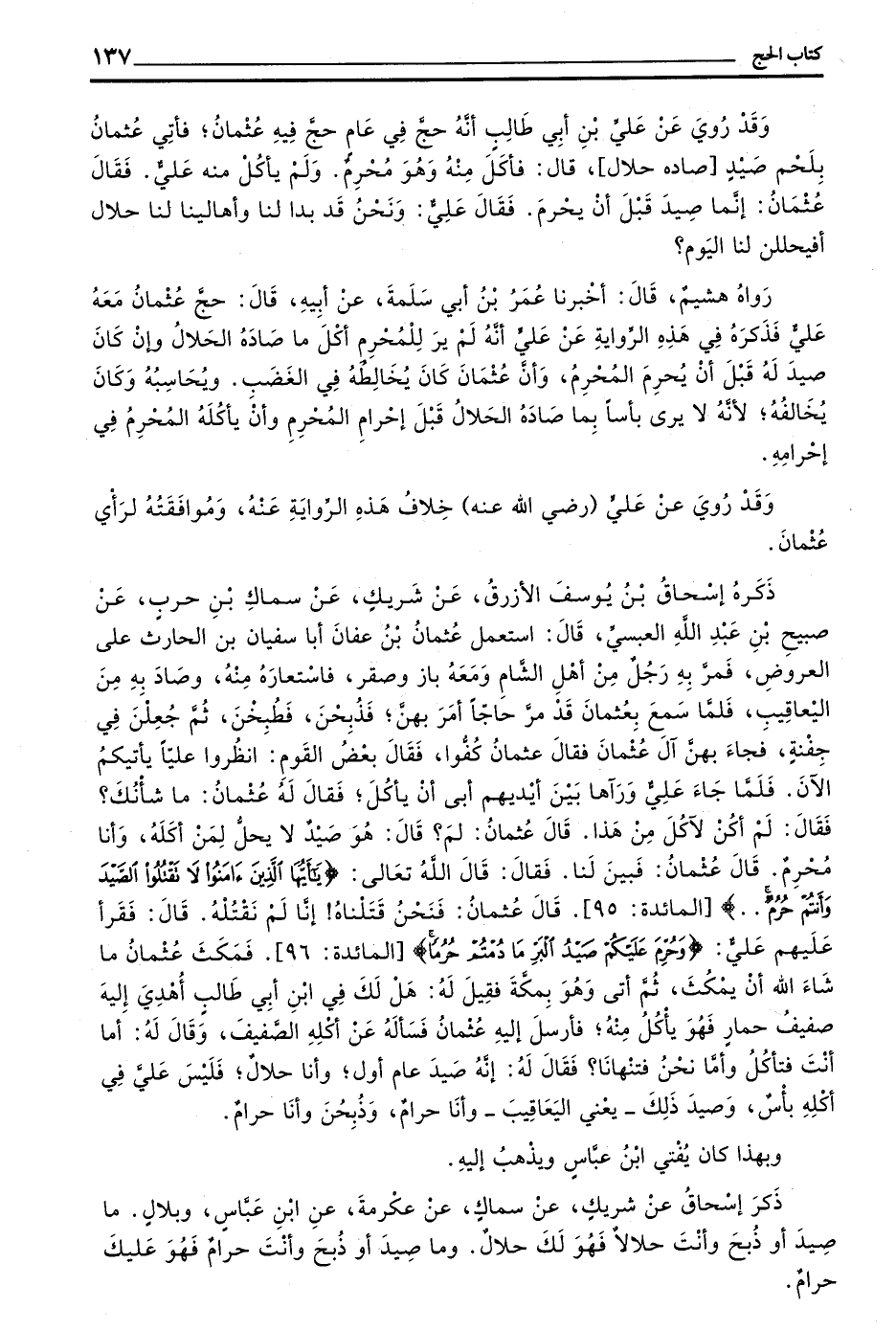 وَقَدْ رُوِيَ عَنْ عَلِيِّ بْنِ أَبِي طَالِبٍ أَنَّهُ حَجَّ فِي عَامٍ حَجَّ فِيهِ عُثْمَانُ فَأُتِيَ عُثْمَانُ بِلَحْمِ صَيْدٍ صَادَهُ حَلَالٌ قَالَ فَأَكَلَ مِنْهُ وَهُوَ مُحْرِمٌ وَلَمْ يَأْكُلْ مِنْهُ عَلِيٌّ فَقَالَ عُثْمَانُ إِنَّمَا صِيدَ قَبْلَ أَنْ يُحْرِمَ فَقَالَ عَلِيٌّ وَنَحْنُ قَدْ بَدَا لَنَا وَأَهَالِينَا لَنَا حَلَالٌ أَفَيَحْلُلْنَ لَنَا الْيَوْمَ
