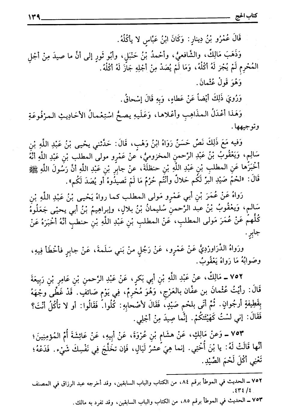 752 - مَالِكٌ عَنْ عَبْدِ اللَّهِ بْنِ أَبِي بَكْرٍ عَنْ عَبْدِ الرَّحْمَنِ بْنِ عَامِرِ بْنِ رَبِيعَةَ قَالَ رَأَيْتُ عُثْمَانَ بْنَ عَفَّانَ بِالْعَرْجِ وَهُوَ مُحْرِمٌ فِي يَوْمٍ صَائِفٍ قَدْ غَطَّى وَجْهَهُ بِقَطِيفَةِ أُرْجُوَانٍ ثُمَّ أُتِيَ بِلَحْمِ صَيْدٍ فَقَالَ لِأَصْحَابِهِ كُلُوا فَقَالُوا أَوَ لَا تَأْكُلُ أَنْتَ فَقَالَ إِنِّي لَسْتُ كَهَيْئَتِكُمْ إِنَّمَا صِيدَ مِنْ أَجْلِي