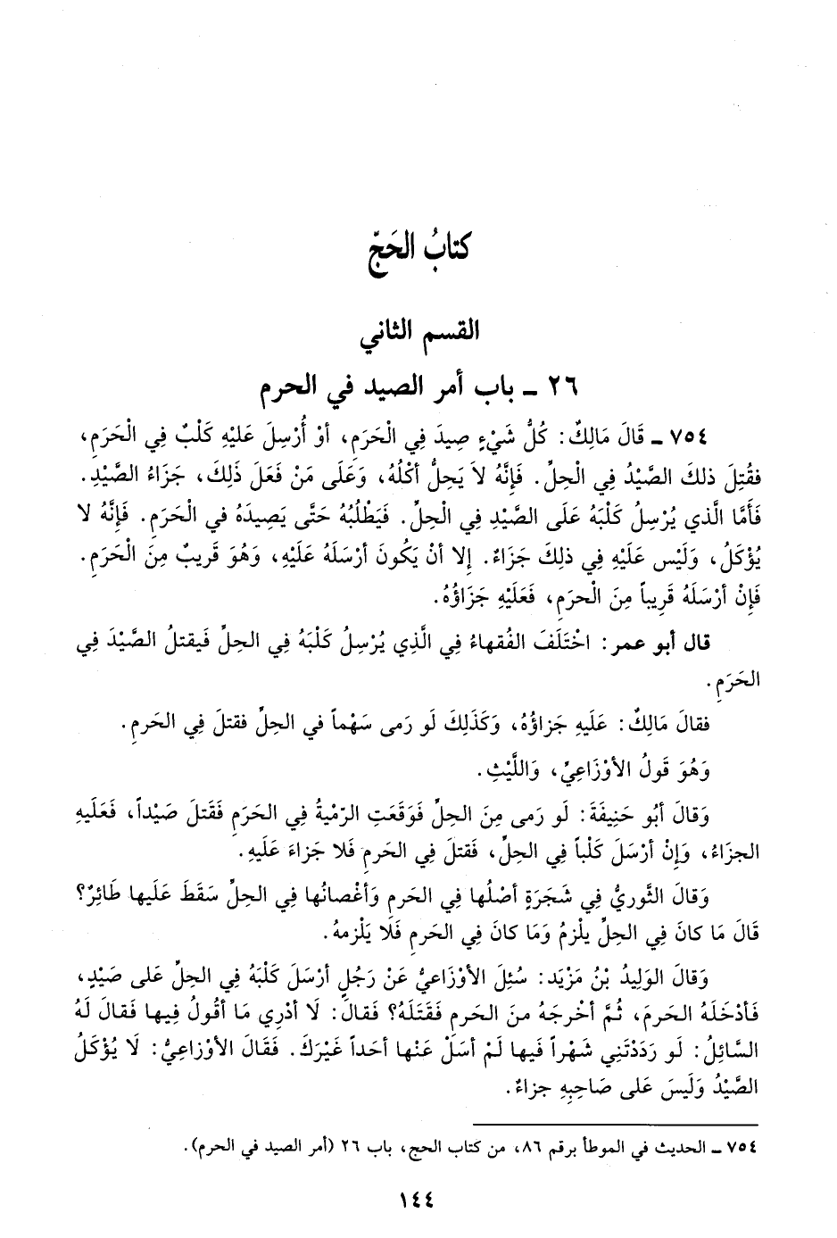 754 - قَالَ مَالِكٌ كُلُّ شَيْءٍ صِيدَ فِي الْحَرَمِ أَوْ أُرْسِلَ عَلَيْهِ كَلْبٌ فِي الْحَرَمِ فَقُتِلَ ذَلِكَ الصَّيْدُ فِي الْحِلِّ فَإِنَّهُ لَا يَحِلُّ أَكْلُهُ وَعَلَى من فعل ذلك جزاء الصيد فَأَمَّا الَّذِي يُرْسِلُ كَلْبَهُ عَلَى الصَّيْدِ فِي الْحِلِّ فَيَطْلُبُهُ حَتَّى يَصِيدَهُ فِي الْحَرَمِ فَإِنَّهُ لَا يُؤْكَلُ وَلَيْسَ عَلَيْهِ فِي ذَلِكَ جَزَاءٌ إِلَّا أَنْ يَكُونَ أَرْسَلَهُ عَلَيْهِ وَهُوَ قَرِيبٌ مِنَ الْحَرَمِ فَإِنْ أَرْسَلَهُ قَرِيبًا مِنَ الْحَرَمِ فَعَلَيْهِ جَزَاؤُهُ