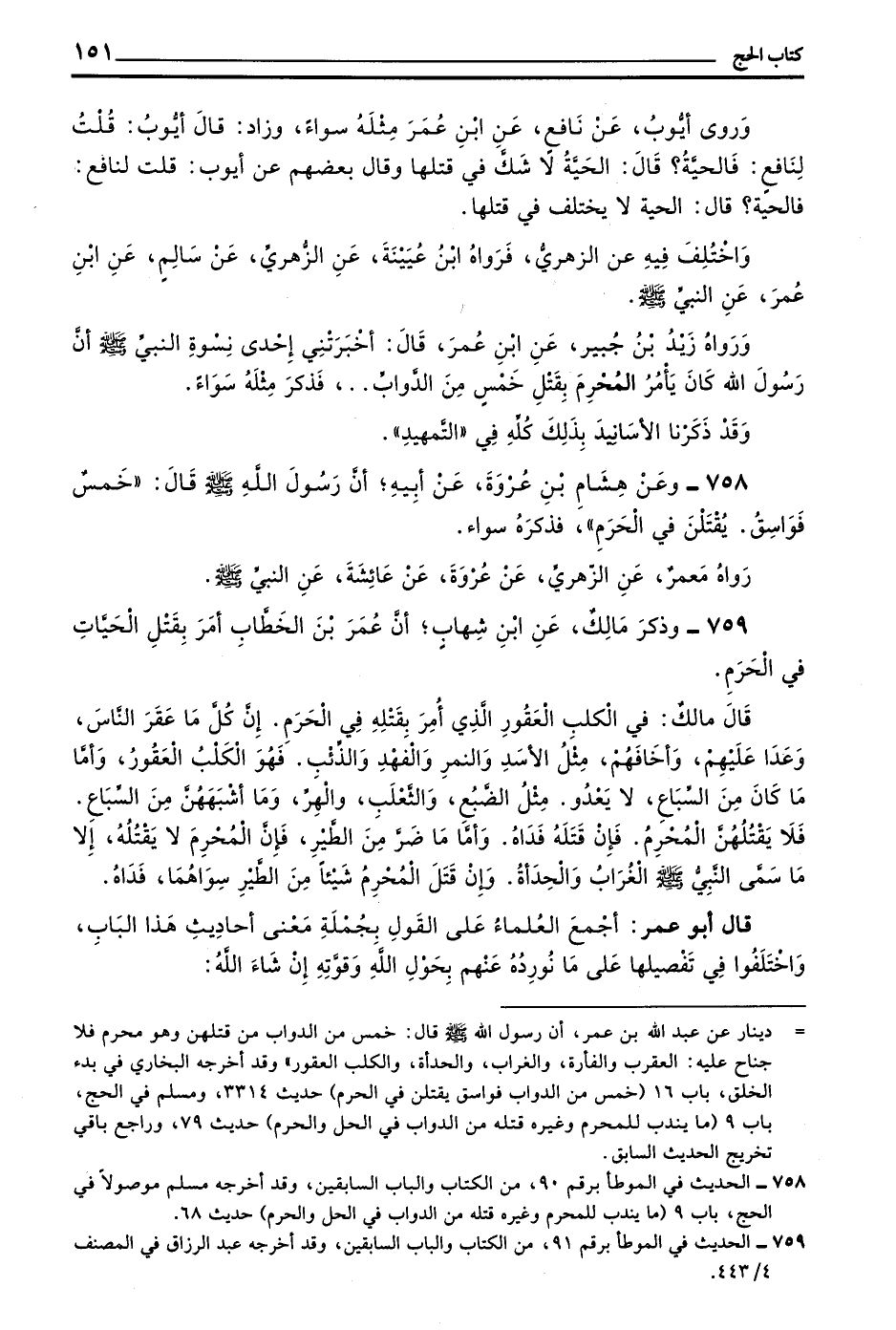 759 - وذكر مالك عن بن شِهَابٍ أَنَّ عُمَرَ بْنَ الْخَطَّابِ أَمَرَ بِقَتْلِ الْحَيَّاتِ فِي الْحَرَمِ