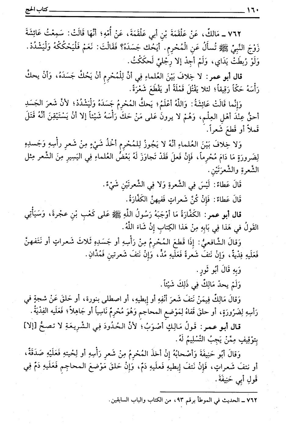 762 - مَالِكٌ عَنْ عَلْقَمَةَ بْنِ أَبِي عَلْقَمَةَ عَنْ أُمِّهِ أَنَّهَا قَالَتْ سَمِعْتُ عَائِشَةَ زَوْجَ النَّبِيِّ صَلَّى اللَّهُ عَلَيْهِ وَسَلَّمَ تُسْأَلُ عَنِ الْمُحْرِمِ أَيَحُكُّ جَسَدَهُ فَقَالَتْ نَعَمْ فَلْيَحْكُكْهُ وَلْيَشْدُدْ وَلَوْ رُبِطَتْ يَدَايَ وَلَمْ أَجِدْ إِلَّا رِجْلَيَّ لَحَكَكْتُ